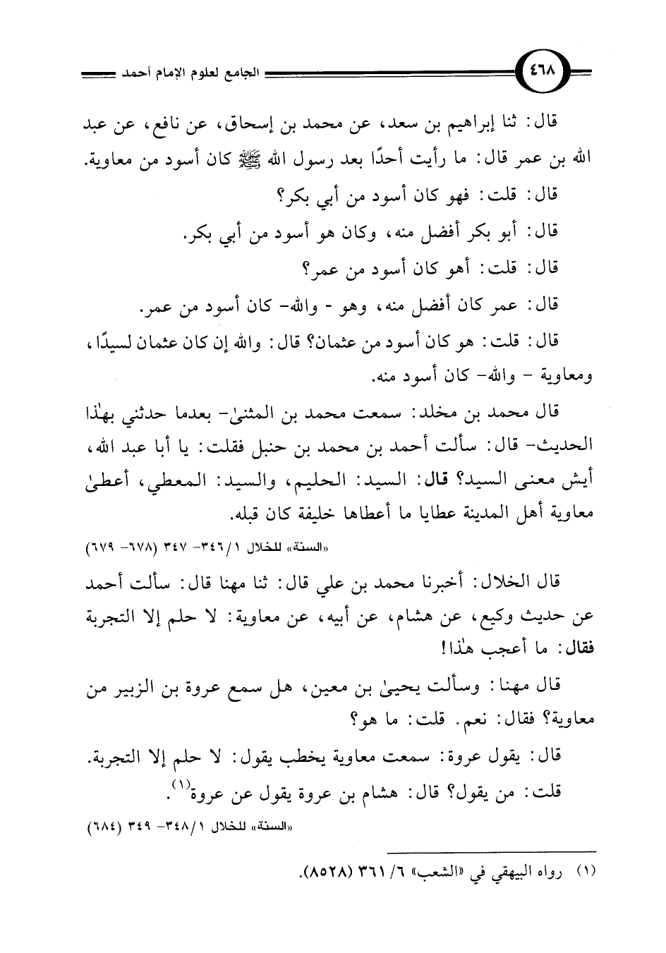 قال محمد بن مخلد: سمعت محمد بن المثنى -بعدما حدثني بهذا الحديث- قال: سألت أحمد بن محمد بن حنبل فقلت: يا أبا عبد اللَّه، أيش معنى السيد؟ قال: السيد: الحليم، والسيد: المعطي، أعطى معاوية أهل المدينة عطايا ما أعطاها خليفة كان قبله.