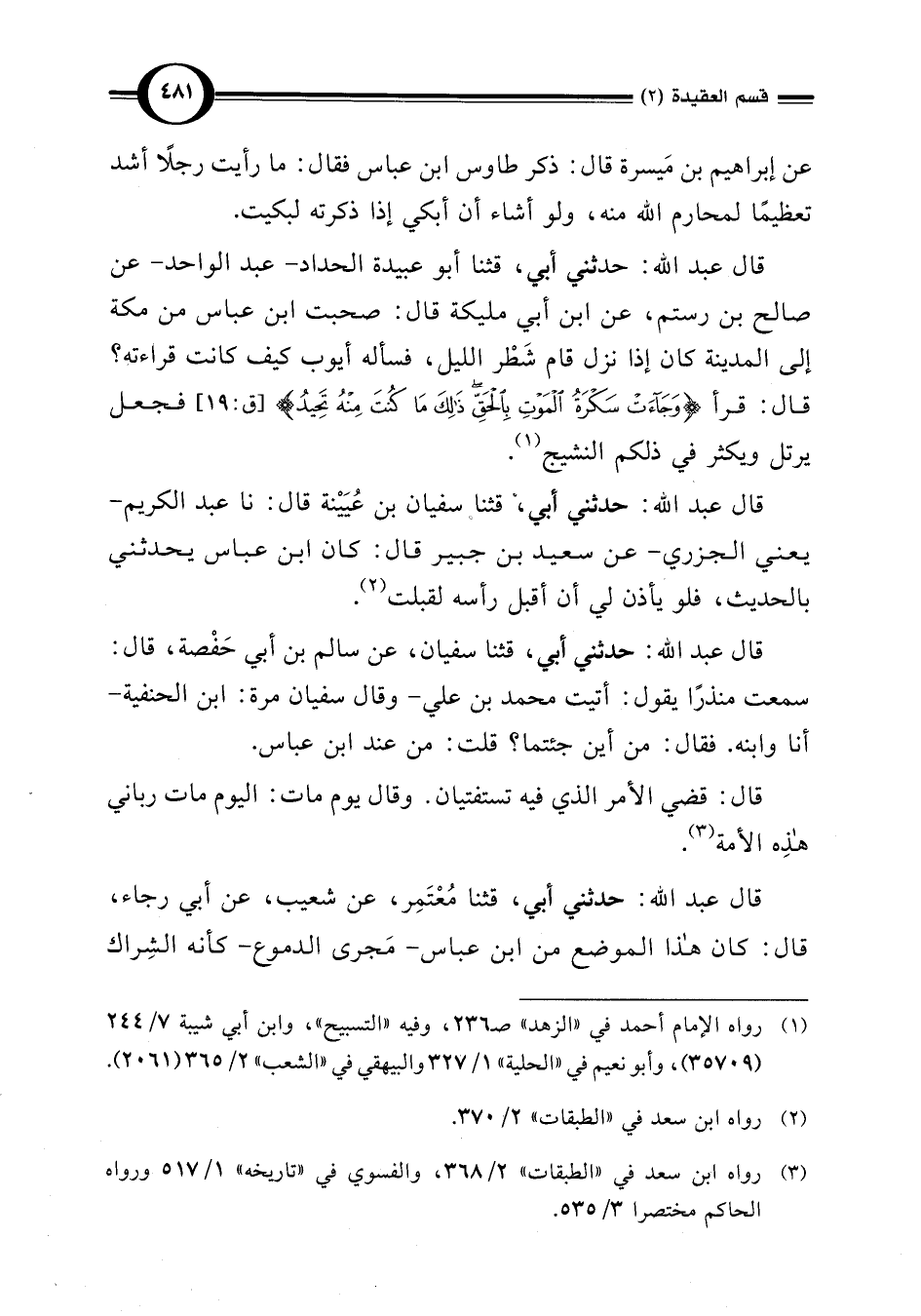 قال عبد اللَّه: حدثني أبي، قثنا أبو عبيدة الحداد -عبد الواحد- عن صالح بن رستم، عن ابن أبي مليكة قال: صحبت ابن عباس من مكة إلى المدينة كان إذا نزل قام شَطْر الليل، فسأله أيوب كيف كانت قراءته؟ قال: قرأ {وَجَاءَتْ سَكْرَةُ الْمَوْتِ بِالْحَقِّ ذَلِكَ مَا كُنْتَ مِنْهُ تَحِيدُ (19)} [ق: 19] فجعل يرتل ويكثر في ذلكم النشيج (¬1).
