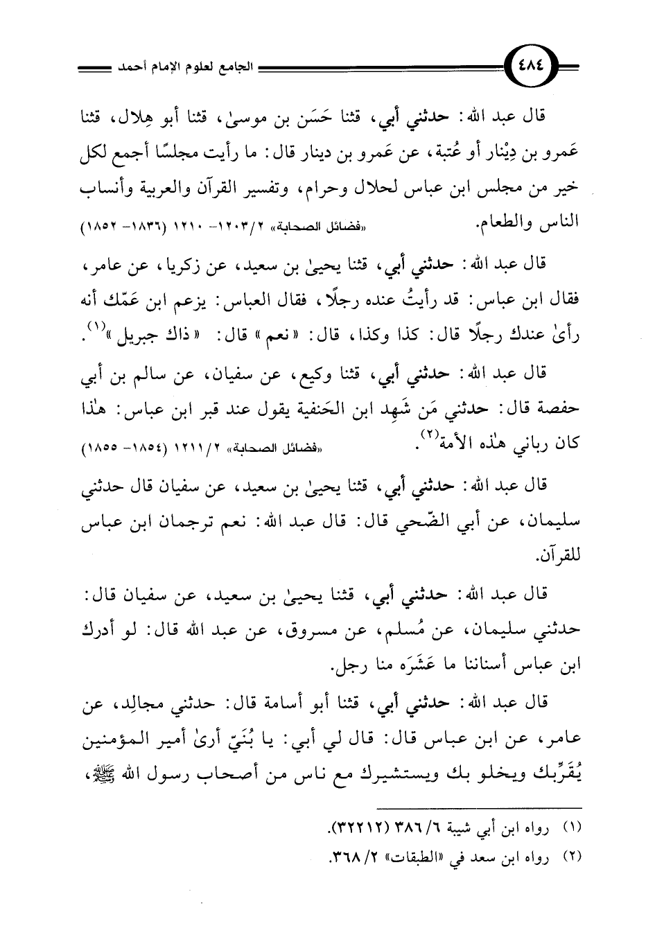 قال عبد اللَّه: حدثني أبي، قثنا يحيى بن سعيد، عن سفيان قال حدثني سليمان، عن أبي الضّحي قال: قال عبد اللَّه: نعم ترجمان ابن عباس للقرآن.