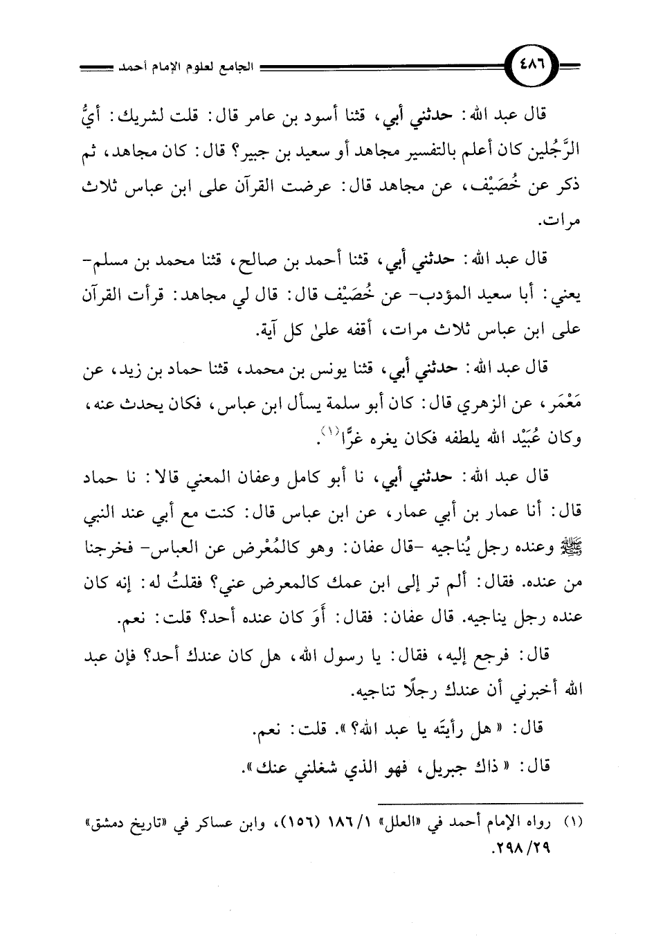 قال عبد اللَّه: حدثني أبي، قثنا أسود بن عامر قال: قلت لشريك: أيُّ الرَّجُلين كان أعلم بالتفسير مجاهد أو سعيد بن جبير؟ قال: كان مجاهد، ثم ذكر عن خُصَيْف، عن مجاهد قال: عرضت القرآن على ابن عباس ثلاث مرات.