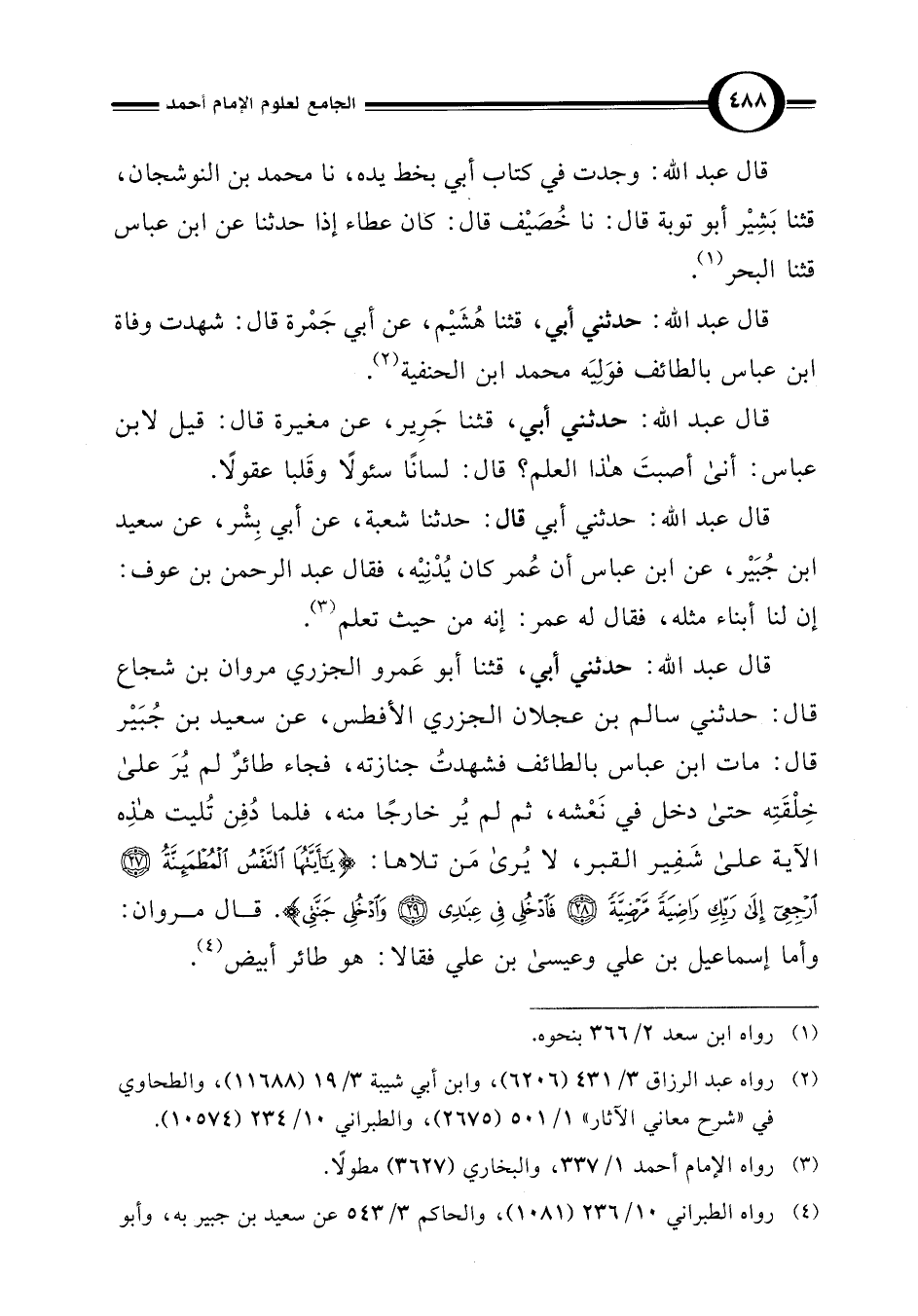 قال عبد اللَّه: حدثني أبي، قثنا أبو عَمرو الجزري مروان بن شجاع قال: حدثني سالم بن عجلان الجزري الأفطس، عن سعيد بن جُبَيْر قال: مات ابن عباس بالطائف فشهدتُ جنازته، فجاء طائرٌ لم يُرَ على خِلْقَتِه حتى دخل في نَعْشه، ثم لم يُر خارجًا منه، فلما دُفِن تُليت هذِه الآية على شَفِير القبر، لا يُرى مَن تلاها: {يَاأَيَّتُهَا النَّفْسُ الْمُطْمَئِنَّةُ (27) ارْجِعِي إِلَى رَبِّكِ رَاضِيَةً مَرْضِيَّةً (28) فَادْخُلِي فِي عِبَادِي (29) وَادْخُلِي جَنَّتِي (30)}. قال مروان: وأما إسماعيل بن علي وعيسى بن علي فقالا: هو طائر أبيض (¬4).