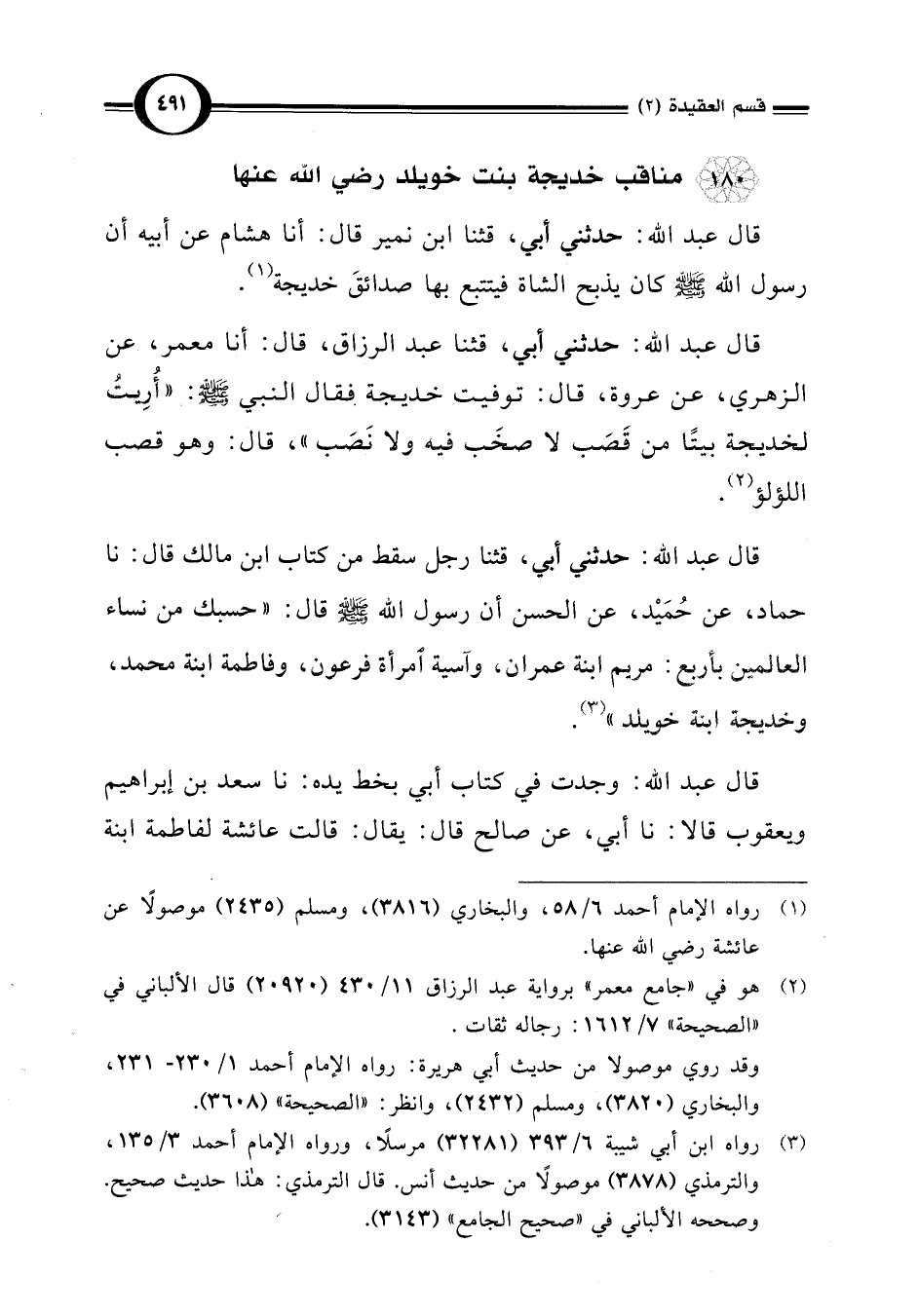 قال عبد اللَّه: حدثني أبي، قثنا ابن نمير قال: أنا هشام عن أبيه أن رسول اللَّه -صلى اللَّه عليه وسلم- كان يذبح الشاة فيتتبع بها صدائقَ خديجة (¬1).