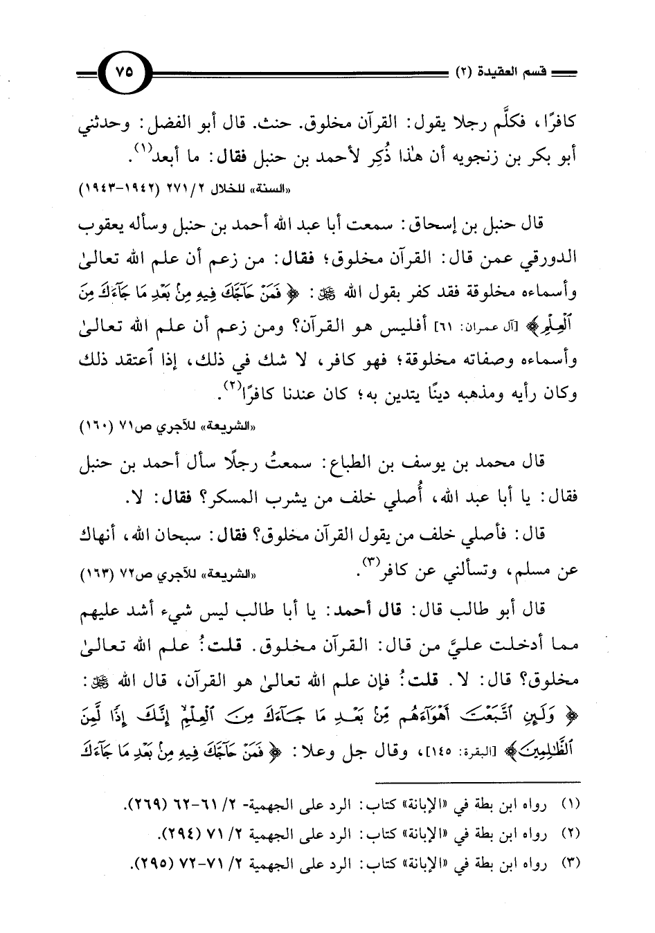 قال حنبل بن إسحاق: سمعت أبا عبد اللَّه أحمد بن حنبل وسأله يعقوب الدورقي عمن قال: القرآن مخلوق؛ فقال: من زعم أن علم اللَّه تعالى وأسماءه مخلوقة فقد كفر بقول اللَّه عَزَّ وَجَلَّ: {فَمَنْ حَاجَّكَ فِيهِ مِنْ بَعْدِ مَا جَاءَكَ مِنَ الْعِلْمِ} [آل عمران: 61] أفليس هو القرآن؟ ومن زعم أن علم اللَّه تعالى وأسماءه وصفاته مخلوقة؛ فهو كافر، لا شك في ذلك، إذا اعتقد ذلك وكان رأيه ومذهبه دينا يتدين به؛ كان عندنا كافرًا (¬2).