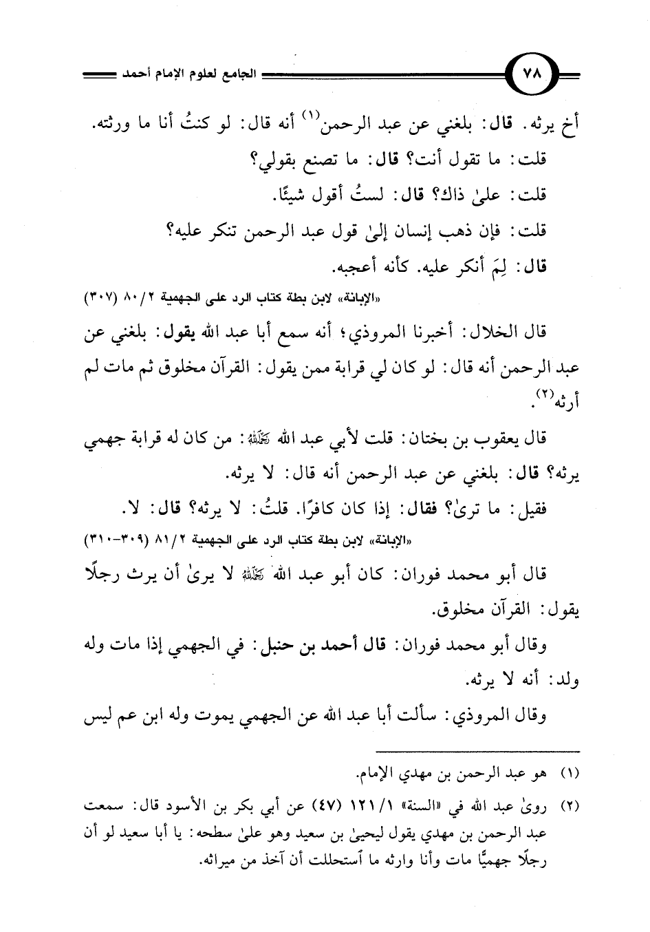 (¬2) روى عبد اللَّه في "السنة" 1/ 121 (47) عن أبي بكر بن الأسود قال: سمعت عبد الرحمن بن مهدي يقول ليحيى بن سعيد وهو على سطحه: يا أبا سعيد لو أن رجلًا جهميًّا مات وأنا وارثه ما استحللت أن آخذ من ميراثه.