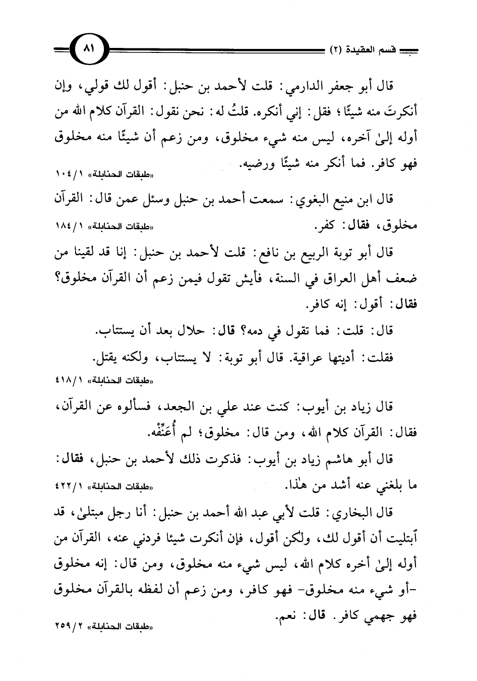 قال أبو جعفر الدارمي: قلت لأحمد بن حنبل: أقول لك قولي، وإن أنكرت منه شيئًا؟ فقل: إني أنكره. قلتُ له: نحن نقول: القرآن كلام اللَّه من أوله إلى آخره، ليس منه شيء مخلوق، ومن زعم أن شيئًا منه مخلوق فهو كافر. فما أنكر منه شيئًا ورضيه.