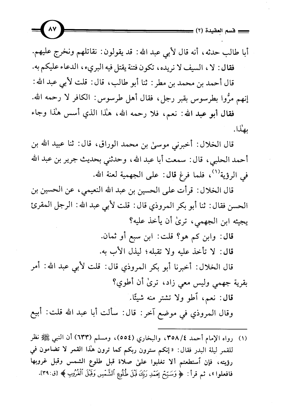 (¬1) رواه الإمام أحمد 4/ 358، والبخاري (554)، ومسلم (633) أن النبي -صلى اللَّه عليه وسلم- نظر للقمر ليلة البدر فقال: "إنكم سترون ربكم كما ترون هذا القمر لا تضامون في رؤيته، فإن استطعتم ألا تغلبوا على صلاة قبل طلوع الشمس وقبل غروبها فافعلوا"، ثم قرأ: {وَسَبِّحْ بِحَمْدِ رَبِّكَ قَبْلَ طُلُوعِ الشَّمْسِ وَقَبْلَ الْغُرُوبِ (39)} [ق: 39].