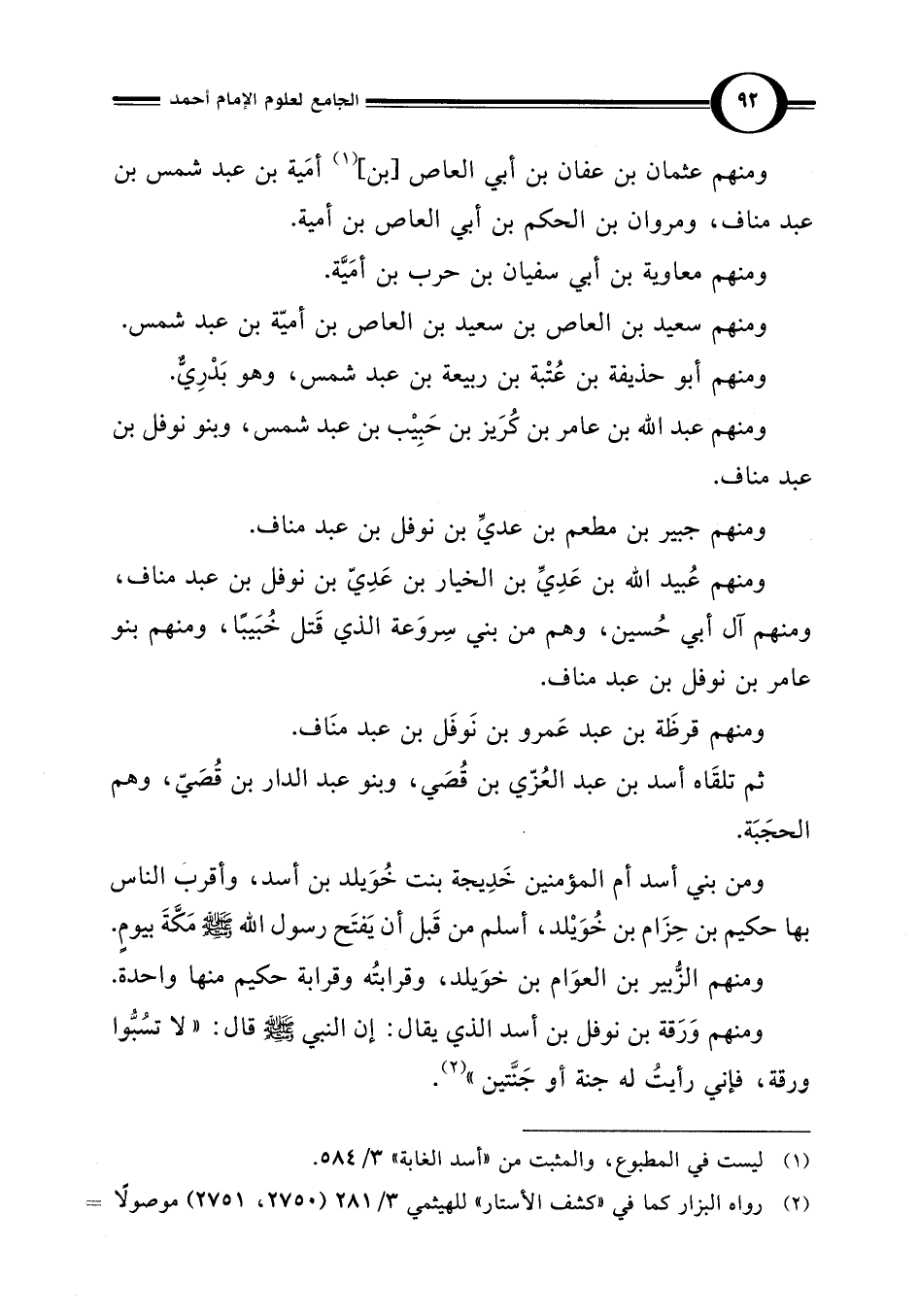 ومنهم وَرَقة بن نوفل بن أسد الذي يقال: إن النبي -صلى اللَّه عليه وسلم- قال: "لا تسُبُّوا ورقة، فإني رأيت له جنة أو جنتين" (¬2).