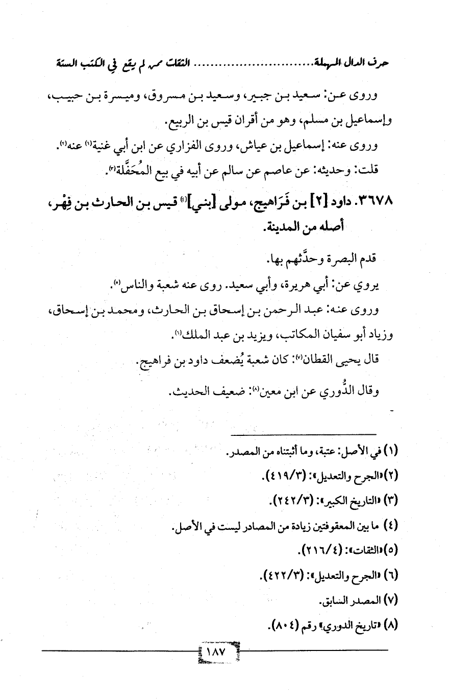 3678 - داود [2] بن فَرَاهيج، مولى [بني] (¬4) قيس بن الحارث بن فِهْر، أصله من المدينة.