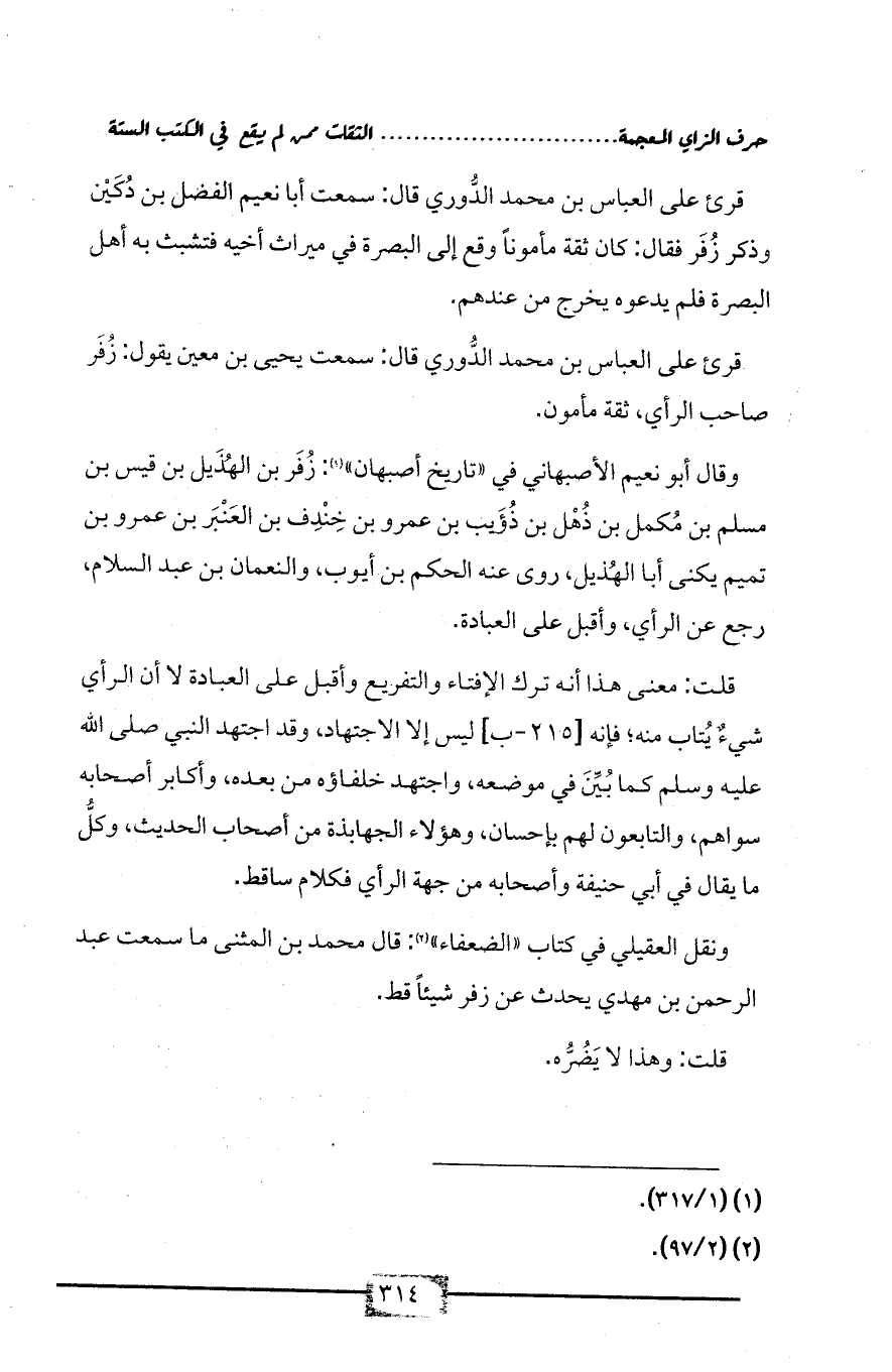 ونقل العقيلي في كتاب «الضعفاء» (¬2): قال محمد بن المثنى ما سمعت عبد الرحمن بن مهدي يحدث عن زفر شيئاً قط.