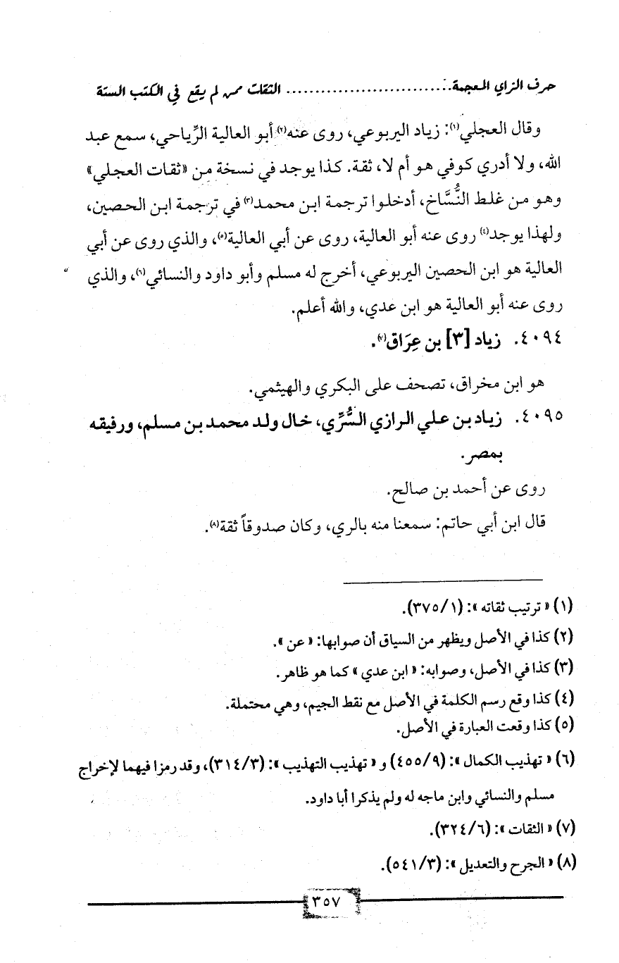وقال العجلي (¬1): زياد اليربوعي، روى عنه (¬2) أبو العالية الرِّياحي، سمع عبد الله، ولا أدري كوفي هو أم لا، ثقة. كذا يوجد في نسخة من «ثقات العجلي» وهو من غلط النُّسَّاخ، أدخلوا ترجمة ابن محمد (¬3) في ترجمة ابن الحصين، ولهذا يوجد (¬4) روى عنه أبو العالية، روى عن أبي العالية (¬5)، والذي روى عن أبي العالية هو ابن الحصين اليربوعي، أخرج له مسلم وأبو داود والنسائي (¬6)، والذي روى عنه أبو العالية هو ابن عدي، والله أعلم.
