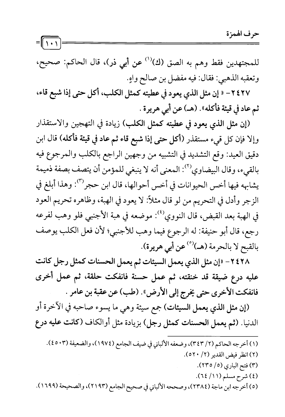 2427 - " إن مثل الذي يعود في عطيته كمثل الكلب، أكل حتى إذا شبع قاء، ثم عاد في قيئة فأكله". (هـ) عن أبي هريرة.