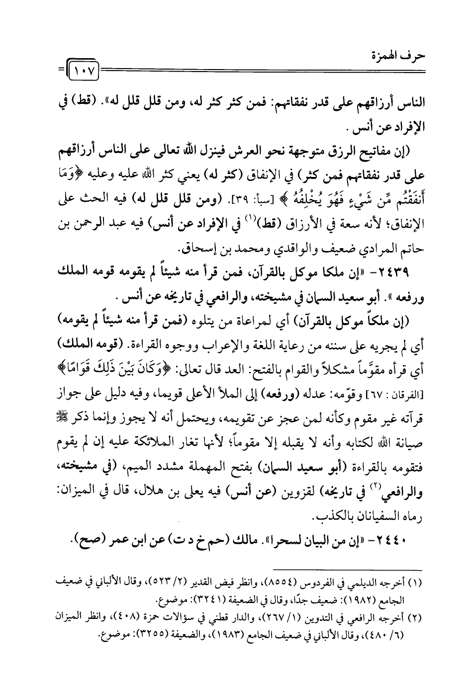 2439 - "إن ملكا موكل بالقرآن، فمن قرأ منه شيئًا لم يقومه قومه الملك ورفعه". أبو سعيد السمان في مشيخته، والرافعي في تاريخه عن أنس.
