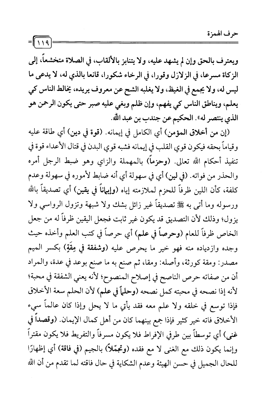 (إن من أخلاق المؤمن) أي الكامل في إيمانه. (قوة في دين) أي طاقة عليه وقيامًا بحقه فيكون قوي القلب في إيمانه فشبه قوي البدن في قتال الأعداء قوة في تنفيذ أحكام الله تعالى. (وحزمًا) بالمهملة والزاي وهو ضبط الرجل أمره والحذر من فواته. (في لين) أي في سهولة أي أنه ضابط لأموره في سهولة وعدم كلفة، كأن اللين ظرفًا للحزم لملازمته إياه (وإيمانًا في يقين) أي تصديقا بالله ورسوله وما أتى به - صلى الله عليه وسلم - تصديقًا غير زائل بشك ولا شبهة وتزول الرواسي ولا يزول؛ وذلك لأن التصديق قد يكون غير ثابت فجعل اليقين ظرفًا له من جعل الخاص ظرفًا للعام (وحرصًا في علم) أي حرصًا في كتب العلم وأخذه حيث وجده وازدياده منه فهو خير ما يحرص عليه (وشفقة في مِقَةٍ) بكسر الميم مصدر: ومقة كورثة، وأصله: ومقا، ثم صنع به ما صنع بوعد في عدة، والمراد أن من صفاته حرص الناصح في إصلاح المنصوح؛ لأنه يعني الشفقة في محبة؛ لأنه إذا نصحه في محبته كمل نصحه (وحلمًا في علم) لأن الحلم سعة الأخلاق فإذا توسع في خلقه ولا علم معه فقد يأتي ما لا يحل وإذا كان عالمًا سيء الأخلاق فاته خير كثير فإذا جمع بينهما كان من أهل كمال الإيمان. (وقصدًا في غنى) أي توسطًا بين طرفي الإفراط فلا يكون مسرفًا والتفريط فلا يكون مقترًا وإنما يكون ذلك مع الغنى لا مع فقده (وتجمّلًا) بالجيم (في فاقة) أي إظهارًا للحال الجميل في حسن الهيئة وعدم الشكاية في حال فاقته لما تقدم من أن الله