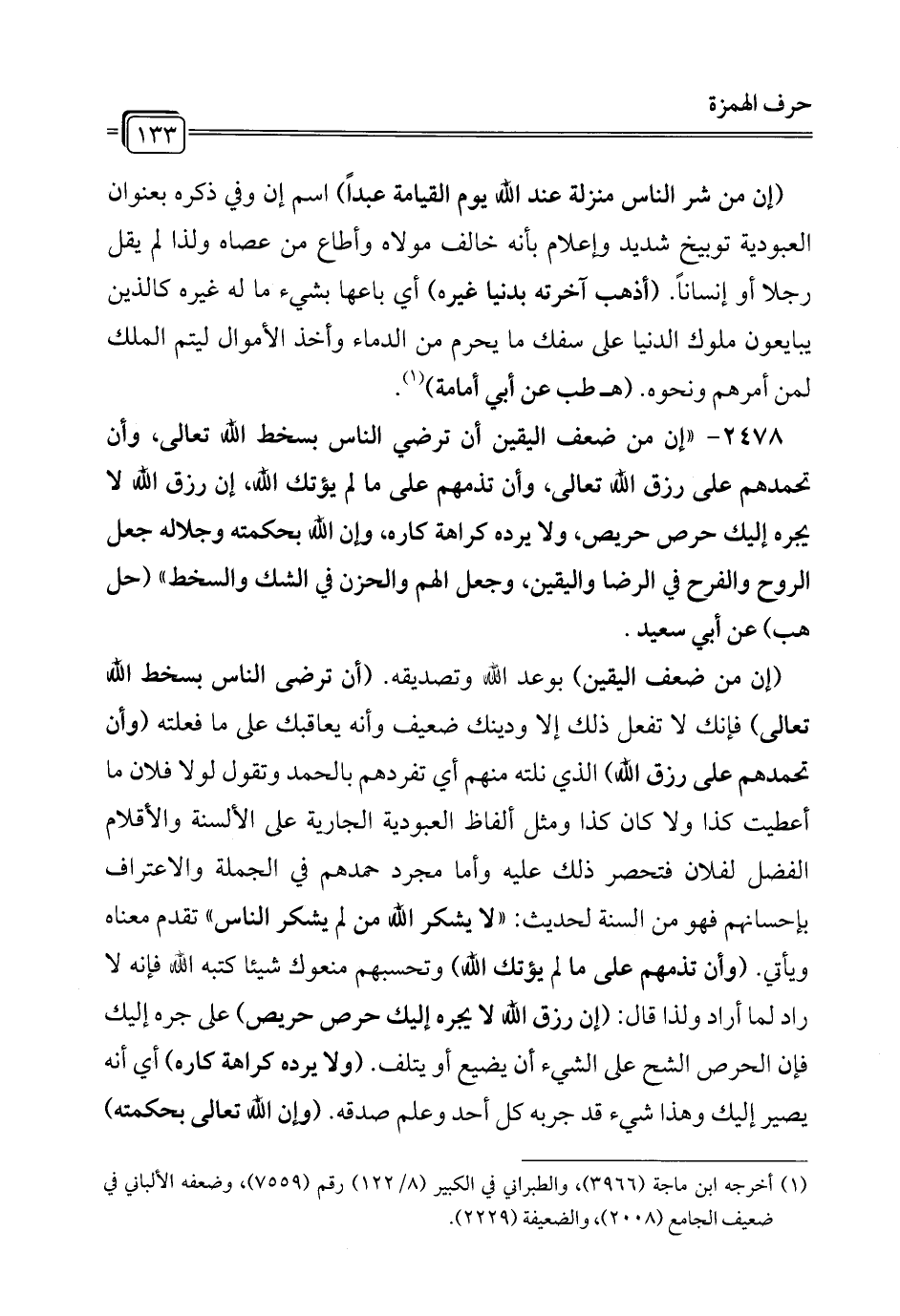 (إن من ضعف اليقين) بوعد الله وتصديقه. (أن ترضى الناس بسخط الله تعالى) فإنك لا تفعل ذلك إلا ودينك ضعيف وأنه يعاقبك على ما فعلته (وأن تحمدهم على رزق الله) الذي نلته منهم أي تفردهم بالحمد وتقول لولا فلان ما أعطيت كذا ولا كان كذا ومثل ألفاظ العبودية الجارية على الألسنة والأقلام الفضل لفلان فتحصر ذلك عليه وأما مجرد حمدهم في الجملة والاعتراف بإحسانهم فهو من السنة لحديث: "لا يشكر الله من لم يشكر الناس" تقدم معناه ويأتي. (وأن تذمهم على ما لم يؤتك الله) وتحسبهم منعوك شيئًا كتبه الله فإنه لا راد لما أراد ولذا قال: (إن رزق الله لا يجره إليك حرص حريص) على جره إليك فإن الحرص الشح على الشيء أن يضيع أو يتلف. (ولا يرده كراهة كاره) أي أنه يصير إليك وهذا شيء قد جربه كل أحد وعلم صدقه. (وإن الله تعالى بحكمته)