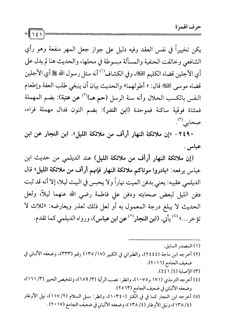 2490 - "إن ملائكة النهار أرأف من ملائكة الليل". ابن النجار عن ابن عباس.