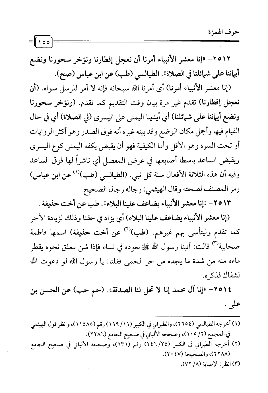 2512 - "إنا معشر الأنبياء أمرنا أن نعجل إفطارنا ونؤخر سحورنا ونضع أيماننا على شمائلنا في الصلاة". الطيالسي (طب) عن ابن عباس (صح).
