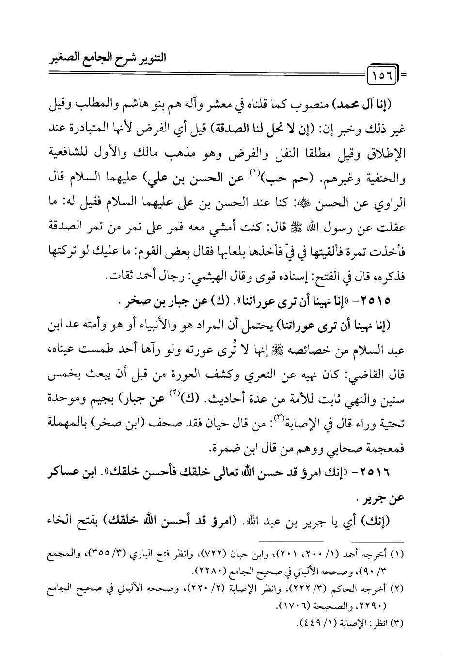 (إنا آل محمَّد) منصوب كما قلناه في معشر وآله هم بنو هاشم والمطلب وقيل غير ذلك وخبر إن: (إن لا تحل لنا الصدقة) قيل أي الفرض لأنها المتبادرة عند الإطلاق وقيل مطلقا النفل والفرض وهو مذهب مالك والأول للشافعية والحنفية وغيرهم. (حم حب) (¬1) عن الحسن بن علي) عليهما السلام قال الراوي عن الحسن - رضي الله عنه -: كنا عند الحسن بن علي عليهما السلام فقيل له: ما عقلت عن رسول الله - صلى الله عليه وسلم - قال: كنت أمشي معه فمر على تمر من تمر الصدقة فأخذت تمرة فألقيتها في فيّ فأخذها بلعابها فقال بعض القوم: ما عليك لو تركتها فذكره، قال في الفتح: إسناده قوى وقال الهيثمي: رجال أحمد ثقات.