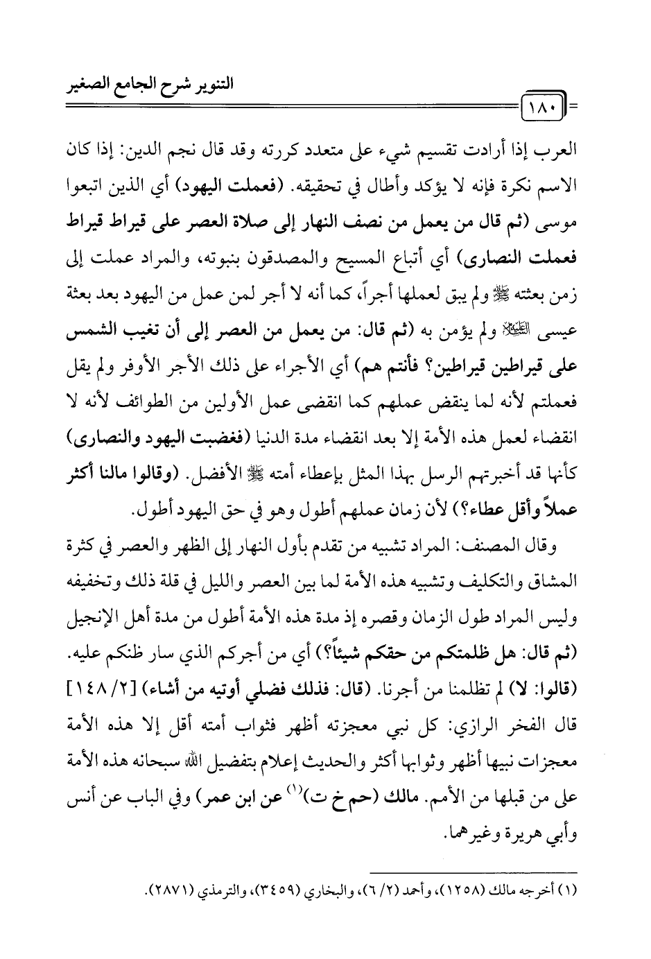 وقال المصنف: المراد تشبيه من تقدم بأول النهار إلى الظهر والعصر في كثرة المشاق والتكليف وتشبيه هذه الأمة لما بين العصر والليل في قلة ذلك وتخفيفه وليس المراد طول الزمان وقصره إذ مدة هذه الأمة أطول من مدة أهل الإنجيل (ثم قال: هل ظلمتكم من حقكم شيئًا؟) أي من أجركم الذي سار ظنكم عليه. (قالوا: لا) لم تظلمنا من أجرنا. (قال: فذلك فضلي أوتيه من أشاء) [2/ 148] قال الفخر الرازي: كل نبي معجزته أظهر فثواب أمته أقل إلا هذه الأمة معجزات نبيها أظهر وثوابها أكثر والحديث إعلام بتفضيل الله سبحانه هذه الأمة على من قبلها من الأمم. مالك (حم خ ت) (¬1) عن ابن عمر) وفي الباب عن أنس وأبي هريرة وغيرهما.