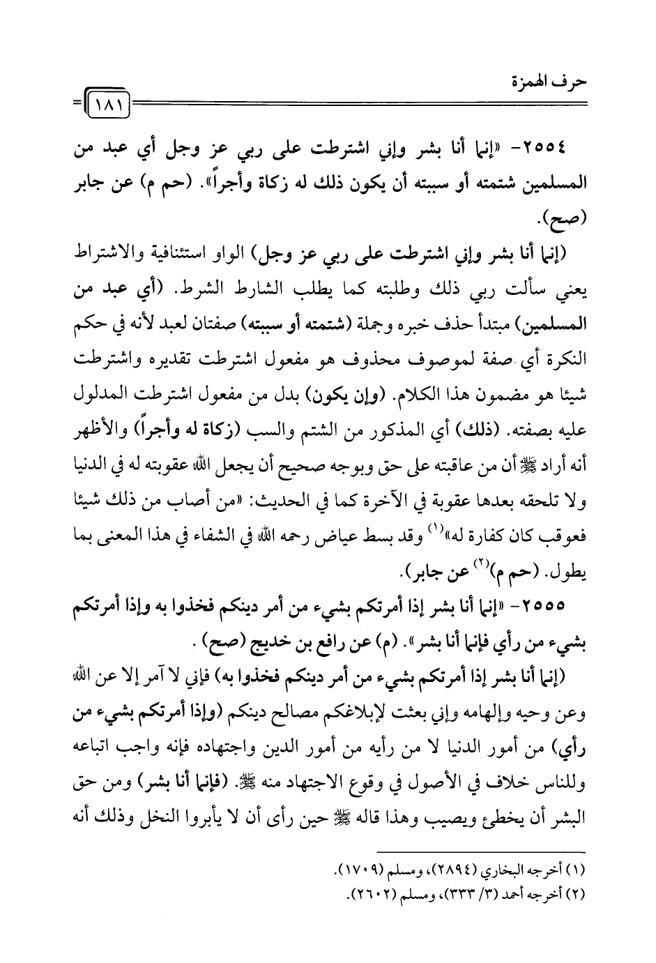 2554 - "إنما أنا بشر وإني اشترطت على ربي عز وجل أي عبد من المسلمين شتمته أو سببته أن يكون ذلك له زكاة وأجرًا". (حم م) عن جابر (صح).