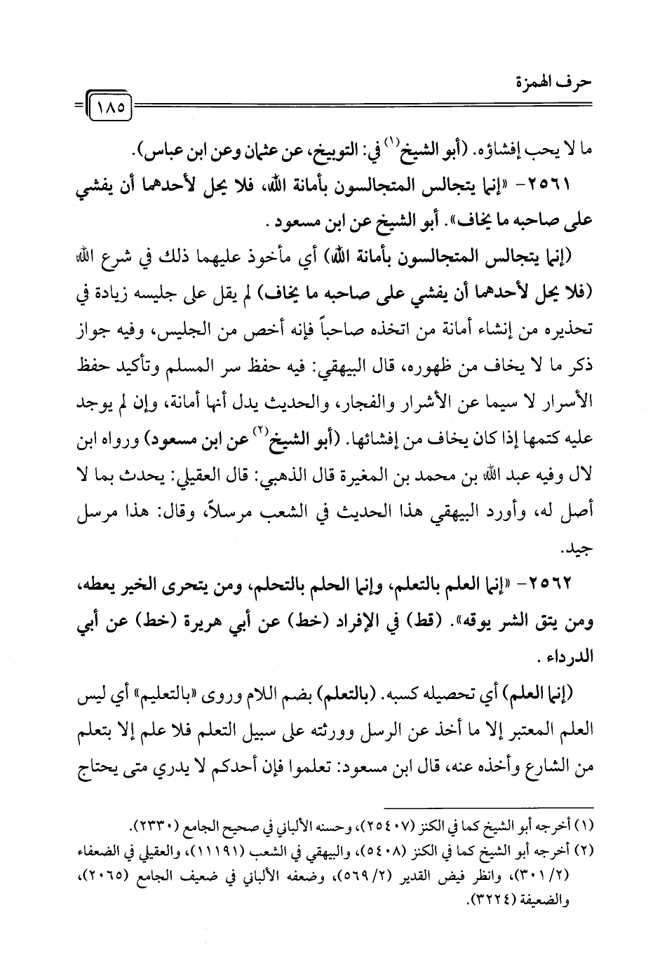 2561 - "إنما يتجالس المتجالسون بأمانة الله، فلا يحل لأحدهما أن يفشي على صاحبه ما يخاف". أبو الشيخ عن ابن مسعود.