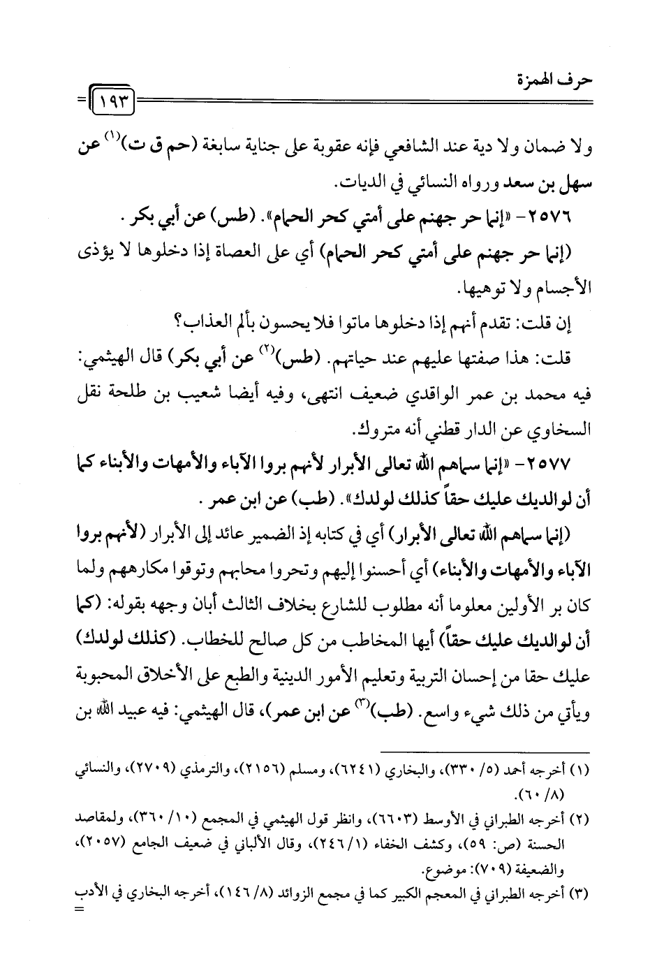 2577 - "إنما سماهم الله تعالى الأبرار لأنهم بروا الآباء والأمهات والأبناء كما أن لوالديك عليك حقاً كذلك لولدك". (طب) عن ابن عمر.