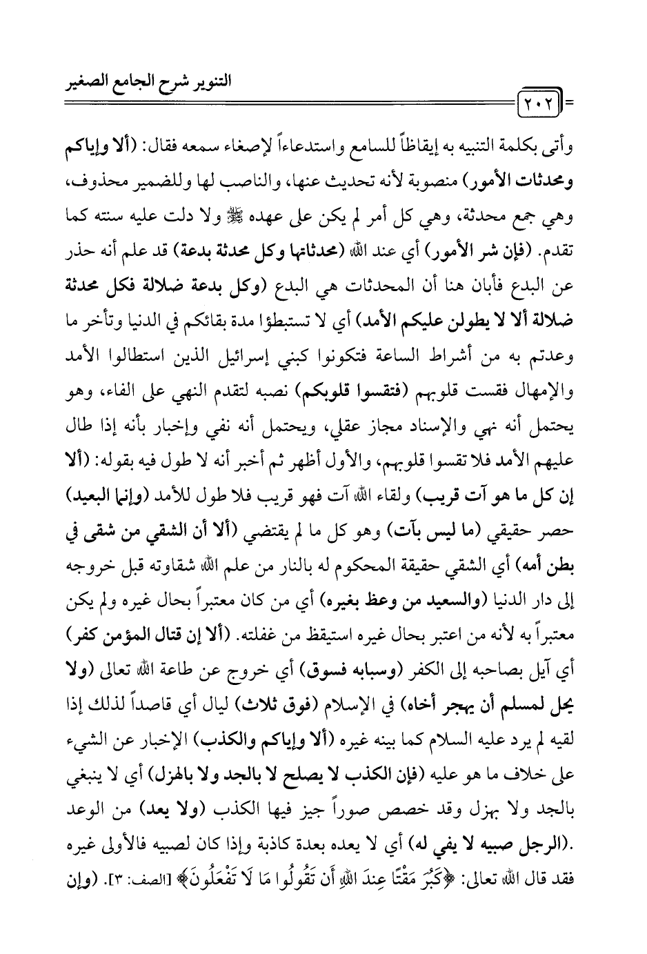 وأتى بكلمة التنبيه به إيقاظاً للسامع واستدعاءاً لإصغاء سمعه فقال: (ألا وإياكم ومحدثات الأمور) منصوبة لأنه تحديث عنها، والناصب لها وللضمير محذوف، وهي جمع محدثة، وهي كل أمر لم يكن على عهد - صلى الله عليه وسلم - ولا دلت عليه سنته كما تقدم. (فإن شر الأمور) أي عند الله (محدثاتها وكل محدثة بدعة) قد علم أنه حذر عن البدع فأبان هنا أن المحدثات هي البدع (وكل بدعة ضلالة فكل محدثة ضلالة ألا لا يطولن عليكم الأمد) أي لا تستبطؤا مدة بقائكم في الدنيا وتأخر ما وعدتم به من أشراط الساعة فتكونوا كبني إسرائيل الذين استطالوا الأمد والإمهال فقست قلوبهم (فتقسوا قلوبكم) نصبه لتقدم النهي على الفاء، وهو يحتمل أنه نهي والإسناد مجاز عقلي، ويحتمل أنه نفي وإخبار بأنه إذا طال عليهم الأمد فلا تقسوا قلوبهم، والأول أظهر ثم أخبر أنه لا طول فيه بقوله: (ألا إن كل ما هو آت قريب) ولقاء الله آت فهو قريب فلا طول للأمد (وإنما البعيد) حصر حقيقي (ما ليس بآت) وهو كل ما لم يقتضي (ألا أن الشقي من شقى في بطن أمه) أي الشقي حقيقة المحكوم له بالنار من علم الله شقاوته قبل خروجه إلى دار الدنيا (والسعيد من وعظ بغيره) أي من كان معتبراً بحال غيره ولم يكن معتبراً به لأنه من اعتبر بحال غيره استيقظ من غفلته. (ألا إن قتال المؤمن كفر) أي آيل بصاحبه إلى الكفر (وسبابه فسوق) أي خروج عن طاعة الله تعالى (ولا يحل لمسلم أن يهجر أخاه) في الإِسلام (فوق ثلاث) ليال أي قاصداً لذلك إذا لقيه لم يرد عليه السلام كما بينه غيره (ألا وإياكم والكذب) الإخبار عن الشيء على خلاف ما هو عليه (فإن الكذب لا يصلح لا بالجد ولا بالهزل) أي لا ينبغي بالجد ولا بهزل وقد خصص صوراً جيز فيها الكذب (ولا يعد) من الوعد (الرجل صبيه لا يفي له) أي لا يعده بعدة كاذبة وإذا كان لصبيه فالأولى غيره فقد قال الله تعالى: {كَبُرَ مَقْتًا عِنْدَ اللَّهِ أَنْ تَقُولُوا مَا لَا تَفْعَلُونَ} [الصف: 3]. (وإن