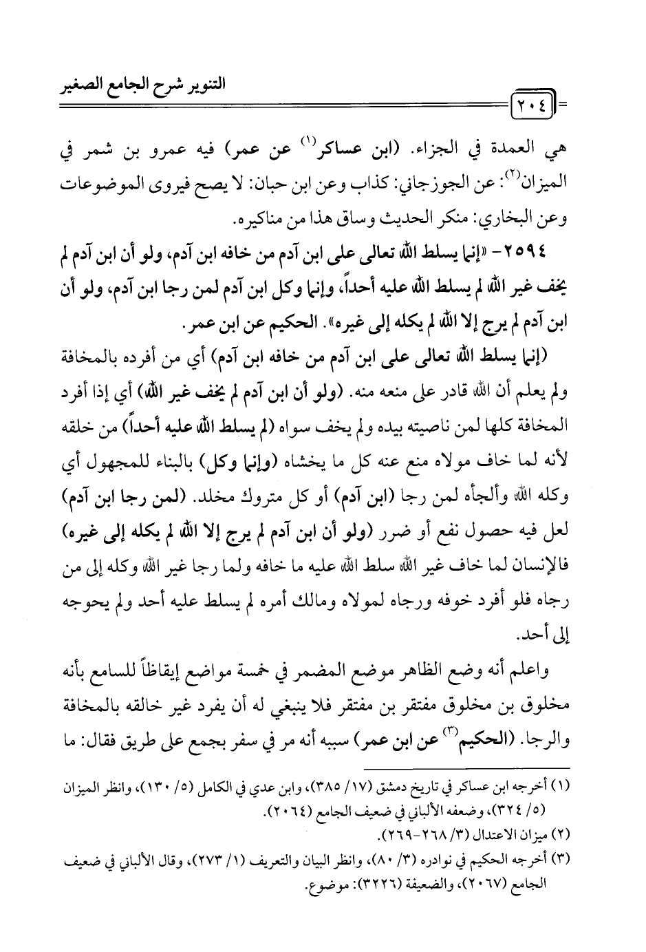 2594 - "إنما يسلط الله تعالى على ابن آدم من خافه ابن آدم، ولو أن ابن آدم لم يخف غير الله لم يسلط الله عليه أحداً، وإنما وكل ابن آدم لمن رجا ابن آدم، ولو أن ابن آدم لم يرج إلا الله لم يكله إلى غيره". الحكيم عن ابن عمر.