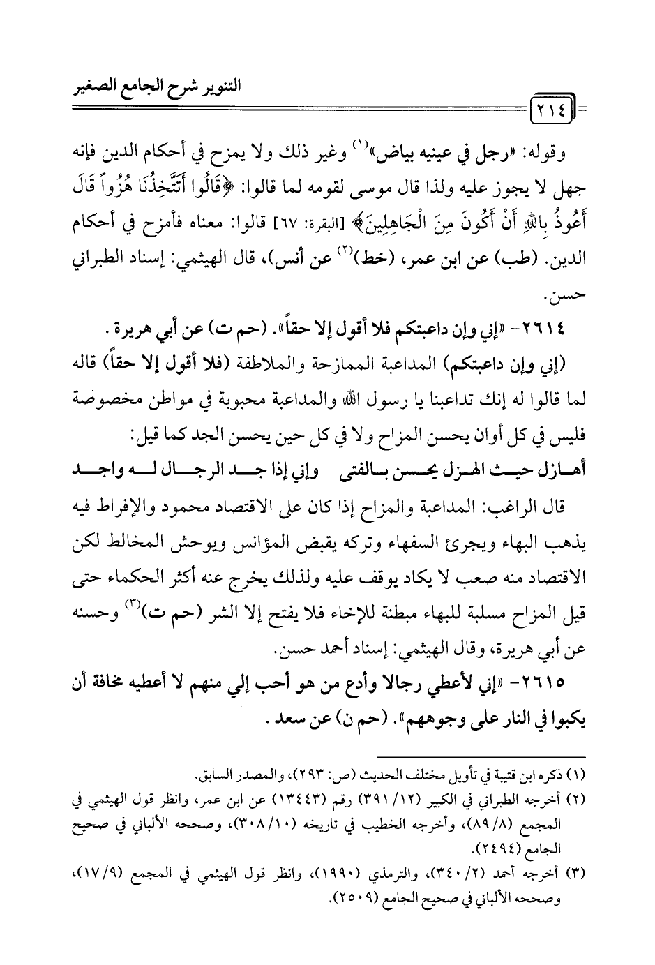 وقوله: "رجل في عينيه بياض" (¬1) وغير ذلك ولا يمزح في أحكام الدين فإنه جهل لا يجوز عليه ولذا قال موسى لقومه لما قالوا: {قَالُوا أَتَتَّخِذُنَا هُزُوًا قَالَ أَعُوذُ بِاللَّهِ أَنْ أَكُونَ مِنَ الْجَاهِلِينَ} [البقرة: 67] قالوا: معناه فأمزح في أحكام الدين. (طب) عن ابن عمر، (خط) (¬2) عن أنس)، قال الهيثمي: إسناد الطبراني حسن.
