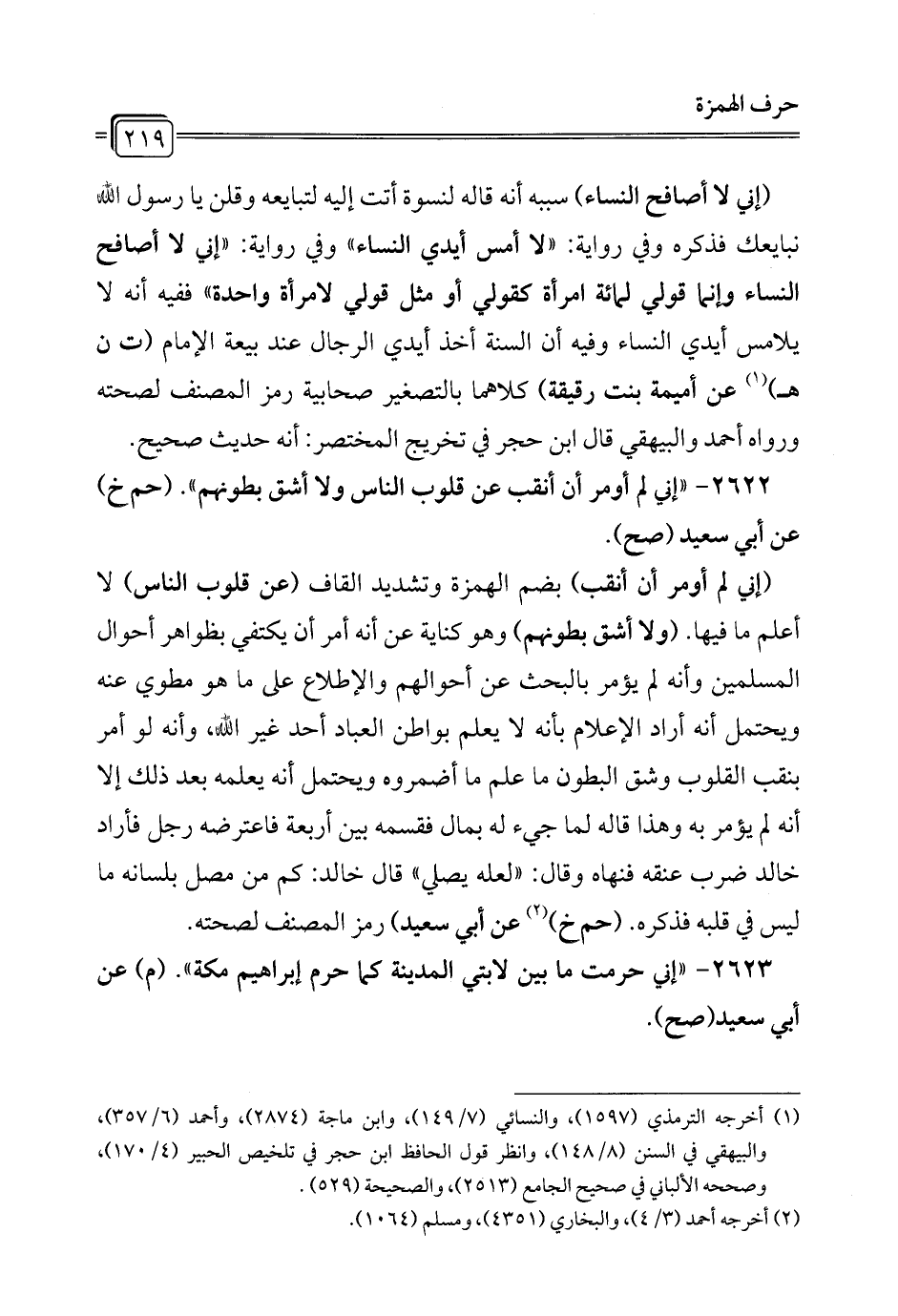 (إني لا أصافح النساء) سببه أنه قاله لنسوة أتت إليه لتبايعه وقلن يا رسول الله نبايعك فذكره وفي رواية: "لا أمس أيدي النساء" وفي رواية: "إني لا أصافح النساء وإنما قولي لمائة امرأة كقولي أو مثل قولي لامرأة واحدة" ففيه أنه لا يلامس أيدي النساء وفيه أن السنة أخذ أيدي الرجال عند بيعة الإِمام (ت ن هـ) (¬1) عن أميمة بنت رقيقة) كلاهما بالتصغير صحابية رمز المصنف لصحته ورواه أحمد والبيهقي قال ابن حجر في تخريج المختصر: أنه حديث صحيح.
