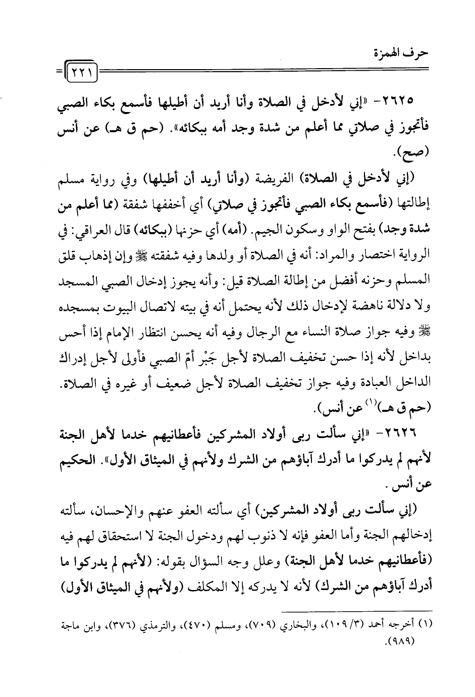 2625 - "إني لأدخل في الصلاة وأنا أريد أن أطيلها فأسمع بكاء الصبي فأتجوز في صلاتي مما أعلم من شدة وجد أمه ببكائه". (حم ق هـ) عن أنس (صح).