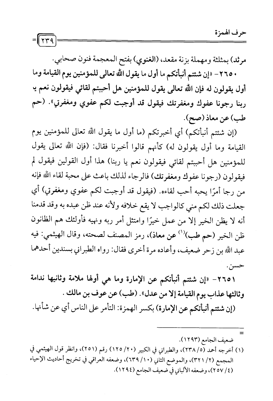 2651 - "إن شئتم أنبأتكم عن الإمارة وما هي أولها ملامة وثانيها ندامة وثالثها عذاب يوم القيامة إلا من عدل". (طب) عن عوف بن مالك.
