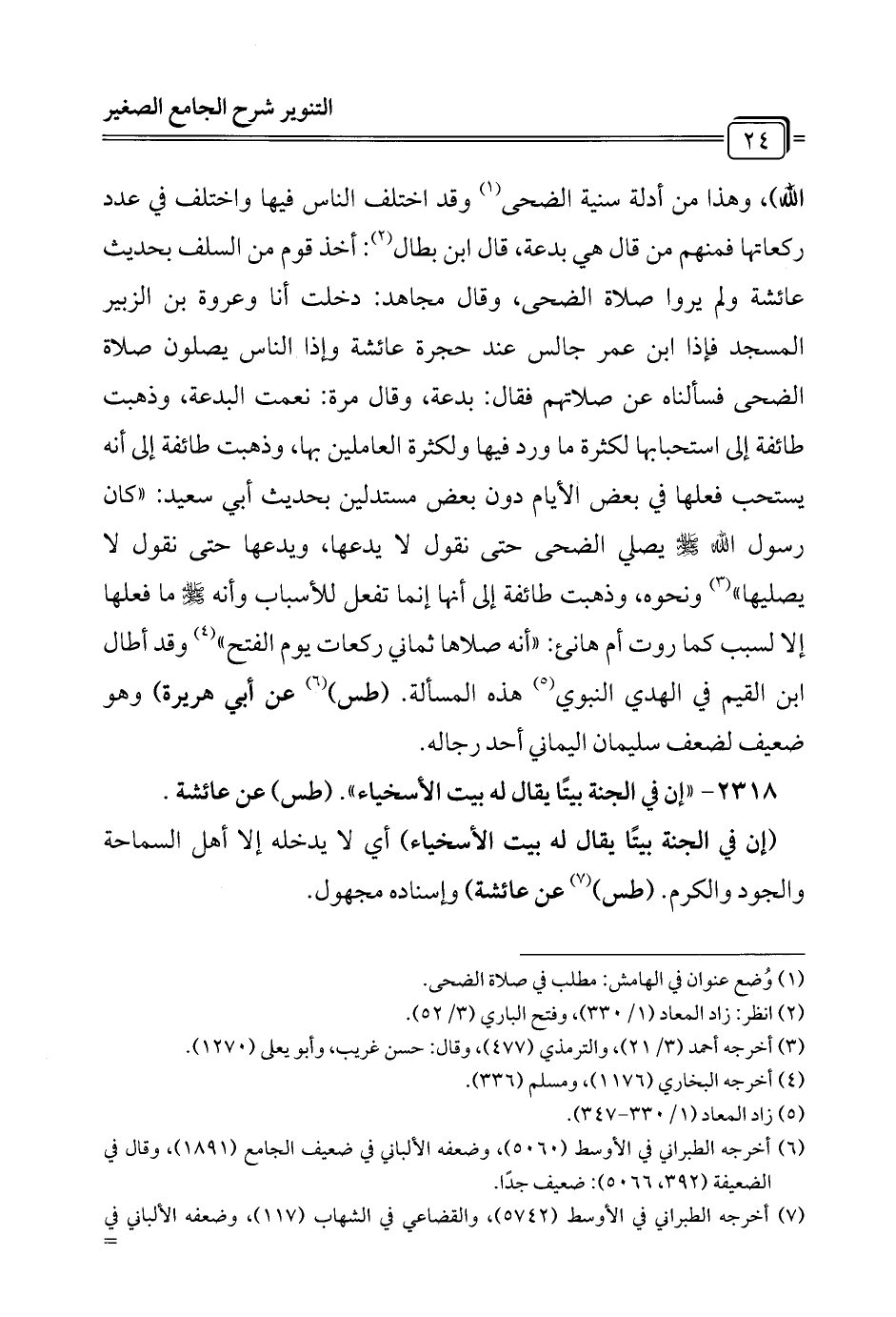 2318 - "إن في الجنّة بيتًا يقال له بيت الأسخياء". (طس) عن عائشة.