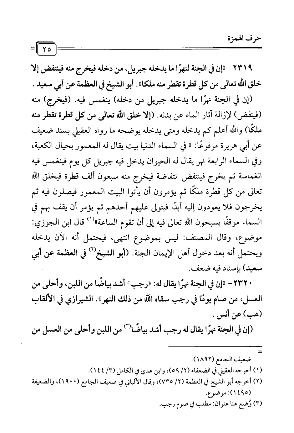 2319 - "إن في الجنة لنهرًا ما يدخله جبريل، من دخله فيخرج منه فينتفض إلا خلق الله تعالى من كل قطرة تقطر منه ملكا". أبو الشيخ في العظمة عن أبي سعيد.