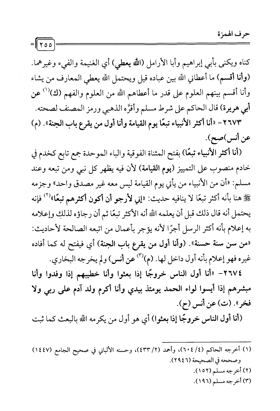 2673 - "أنا أكثر الأنبياء تبعًا يوم القيامة وأنا أول من يقرع باب الجنة". (م) عن أنس) صح).