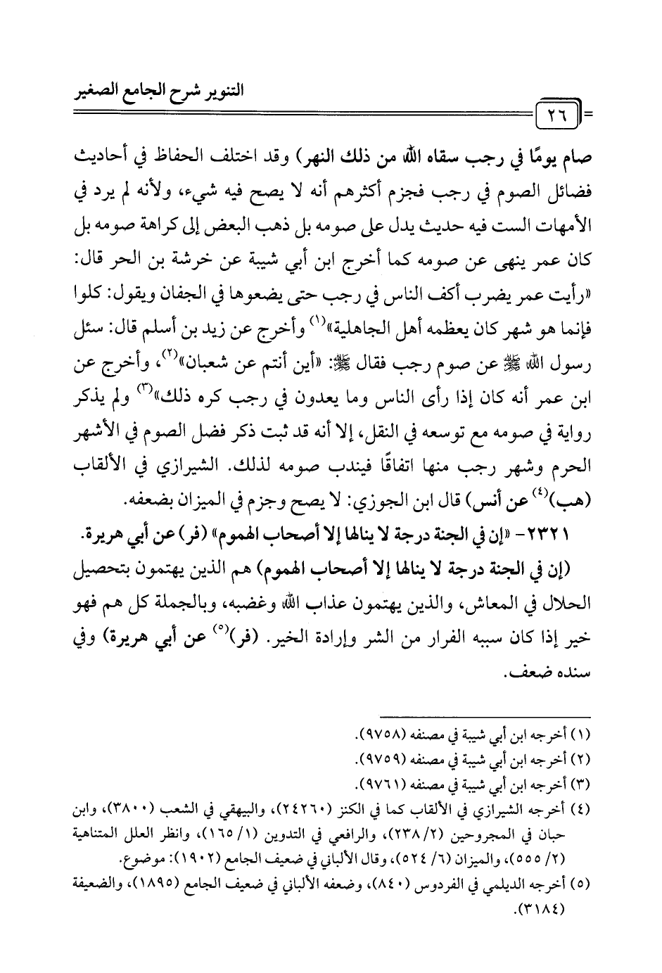 صام يومًا في رجب سقاه الله من ذلك النهر) وقد اختلف الحفاظ في أحاديث فضائل الصوم في رجب فجزم أكثرهم أنه لا يصح فيه شيء، ولأنه لم يرد في الأمهات الست فيه حديث يدل على صومه بل ذهب البعض إلى كراهة صومه بل كان عمر ينهى عن صومه كما أخرج ابن أبي شيبة عن خرشة بن الحر قال: "رأيت عمر يضرب أكف الناس في رجب حتى يضعوها في الجفان ويقول: كلوا فإنما هو شهر كان يعظمه أهل الجاهلية" (¬1) وأخرج عن زيد بن أسلم قال: سئل رسول الله - صلى الله عليه وسلم - عن صوم رجب فقال - صلى الله عليه وسلم -: "أين أنتم عن شعبان" (¬2)، وأخرج عن ابن عمر أنه كان إذا رأى الناس وما يعدون في رجب كره ذلك" (¬3) ولم يذكر رواية في صومه مع توسعه في النقل، إلا أنه قد ثبت ذكر فضل الصوم في الأشهر الحرم وشهر رجب منها اتفاقًا فيندب صومه لذلك. الشيرازي في الألقاب (هب) (¬4) عن أنس) قال ابن الجوزي: لا يصح وجزم في الميزان بضعفه.