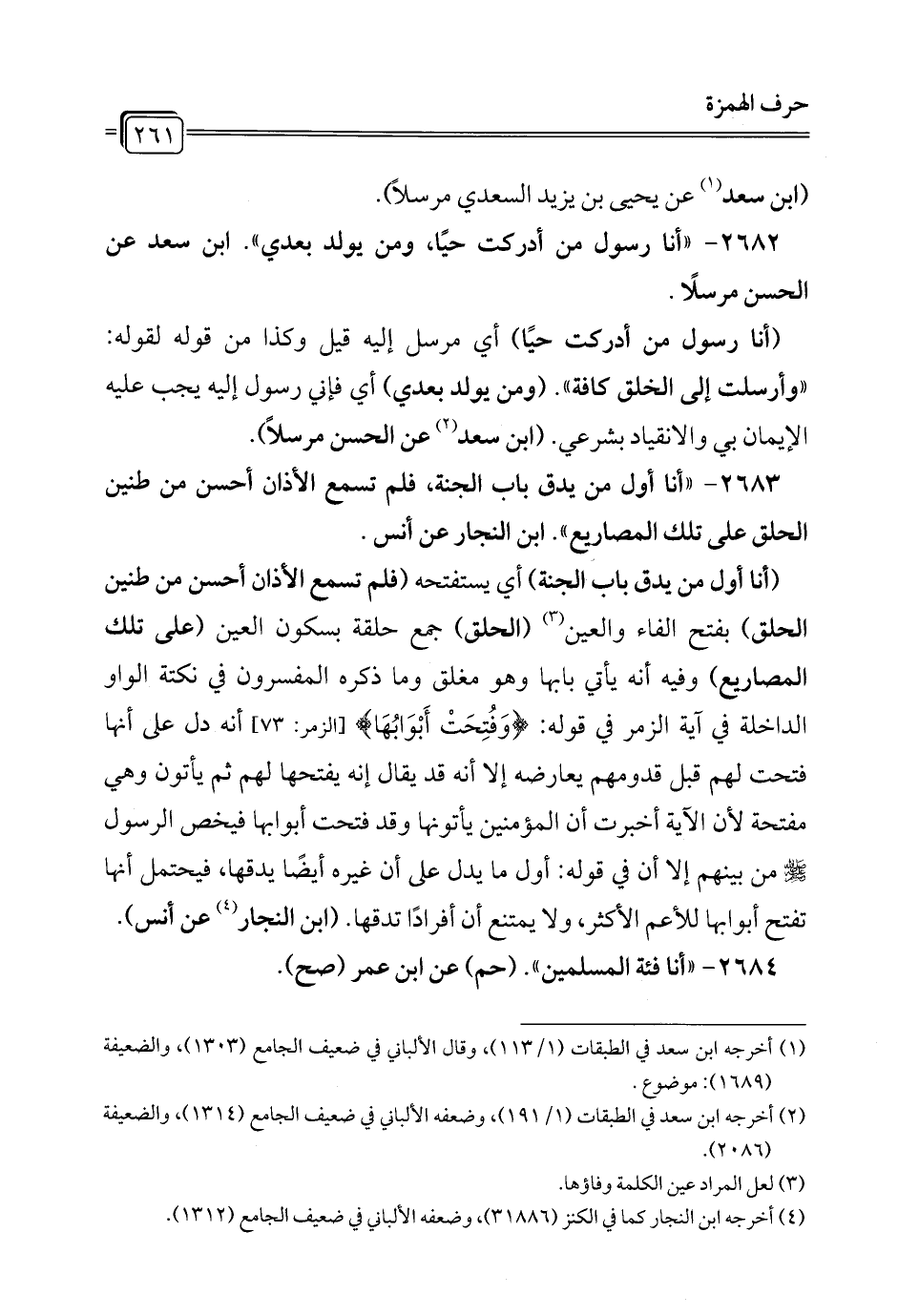 2683 - "أنا أول من يدق باب الجنة، فلم تسمع الأذان أحسن من طنين الحلق على تلك المصاريع". ابن النجار عن أنس.