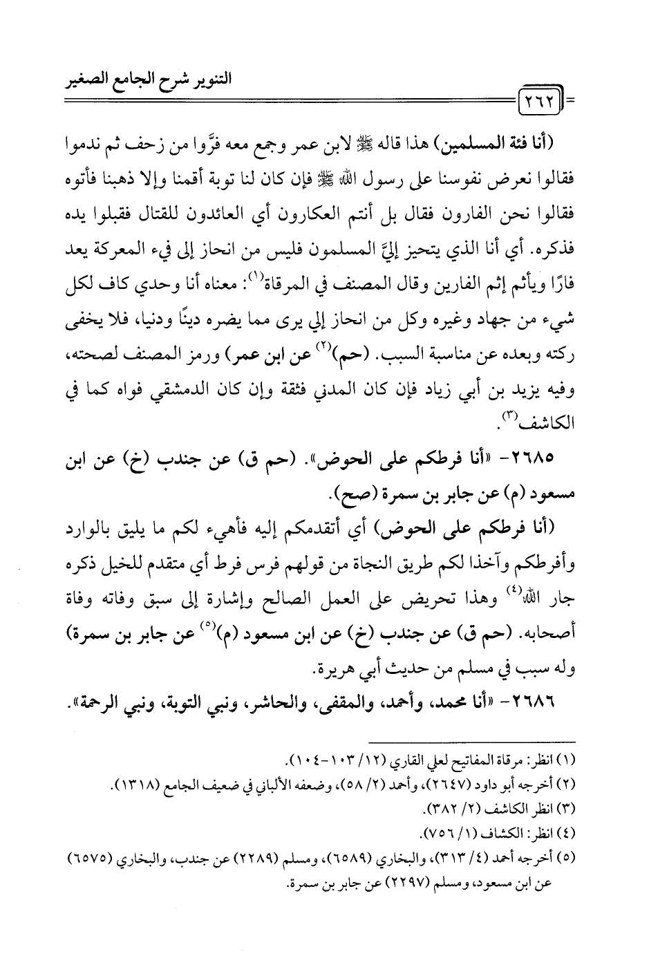 2685 - "أنا فرطكم على الحوض". (حم ق) عن جندب (خ) عن ابن مسعود (م) عن جابر بن سمرة (صح).