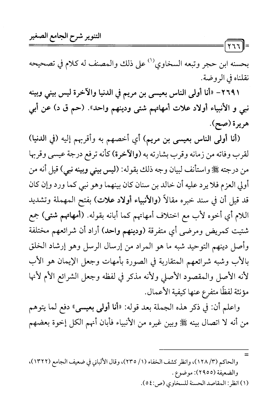 2691 - "أنا أولى الناس بعيسى بن مريم في الدنيا والآخرة ليس بيني وبينه نبي والأنبياء أولاد علات أمهاتهم شتى ودينهم واحد". (حم ق د) عن أبي هريرة (صح).