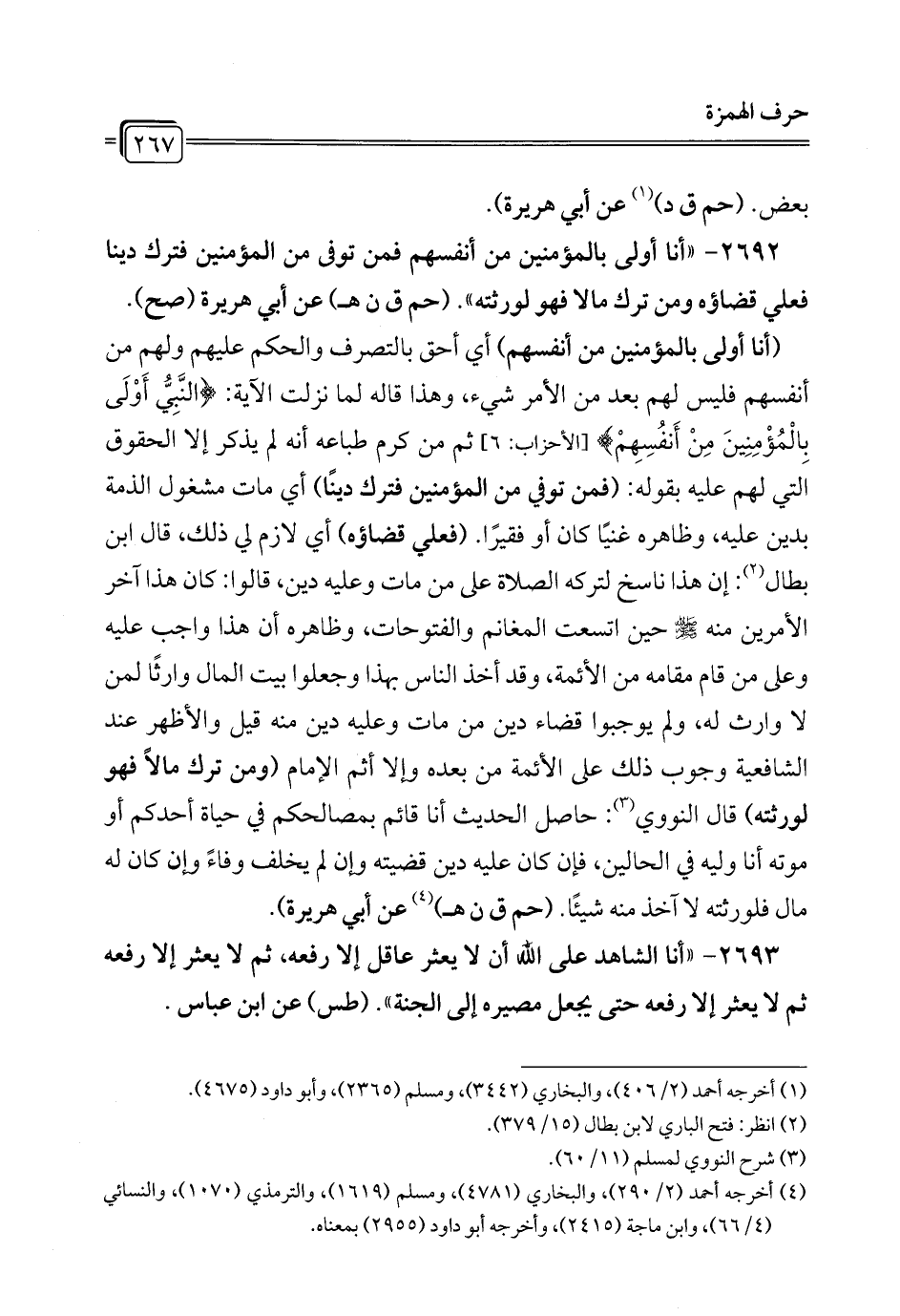 2692 - "أنا أولى بالمؤمنين من أنفسهم فمن توفي من المؤمنين فترك دينا فعلي قضاؤه ومن ترك مالاً فهو لورثته". (حم ق ن هـ) عن أبي هريرة (صح).