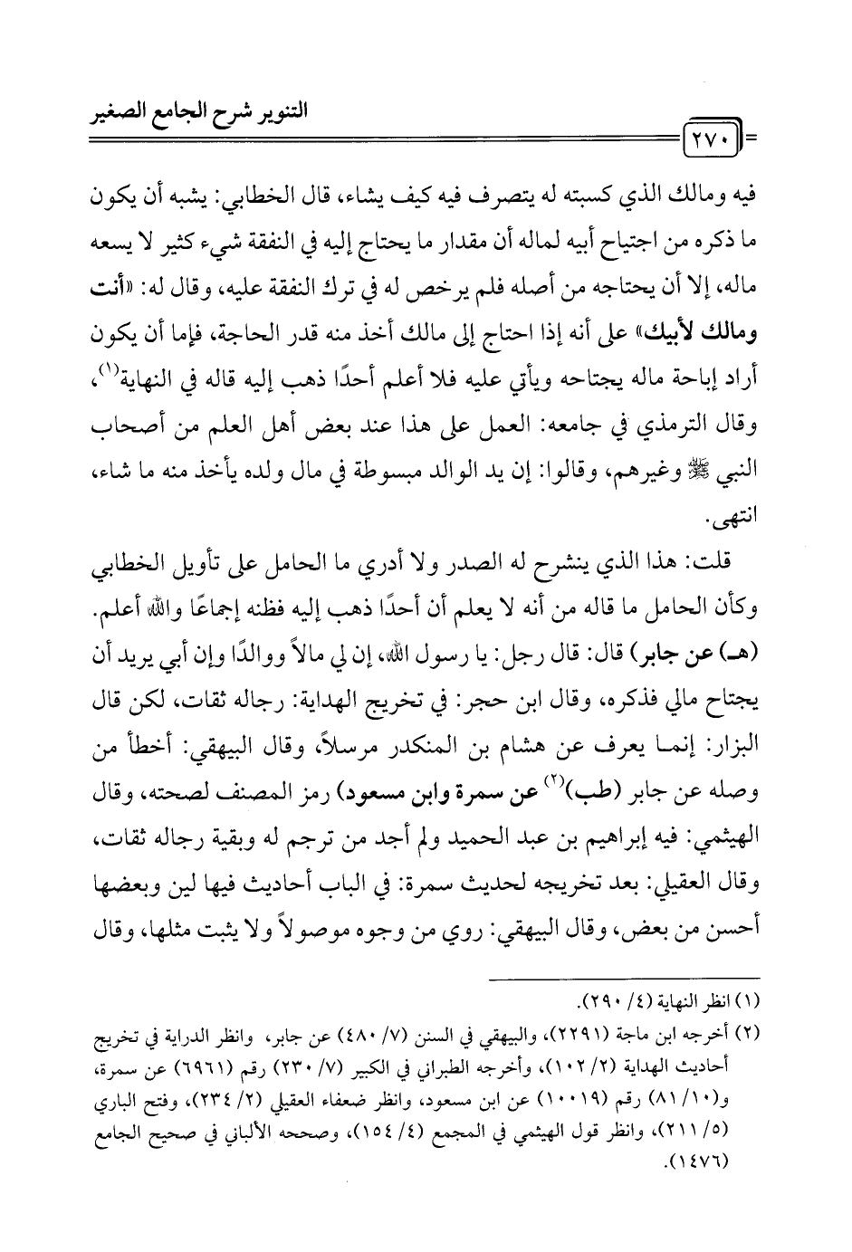 قلت: هذا الذي ينشرح له الصدر ولا أدري ما الحامل على تأويل الخطابي وكأن الحامل ما قاله من أنه لا يعلم أن أحدًا ذهب إليه فظنه إجماعًا والله أعلم. (هـ) عن جابر) قال: قال رجل: يا رسول الله، إن لي مالاً ووالدًا وإن أبي يريد أن يجتاح مالي فذكره، وقال ابن حجر: في تخريج الهداية: رجاله ثقات، لكن قال البزار: إنما يعرف عن هشام بن المنكدر مرسلاً، وقال البيهقي: أخطأ من وصله عن جابر (طب) (¬2) عن سمرة وابن مسعود) رمز المصنف لصحته، وقال الهيثمي: فيه إبراهيم بن عبد الحميد ولم أجد من ترجم له وبقية رجاله ثقات، وقال العقيلي: بعد تخريجه لحديث سمرة: في الباب أحاديث فيها لين وبعضها أحسن من بعض، وقال البيهقي: روي من وجوه موصولاً ولا يثبت مثلها، وقال