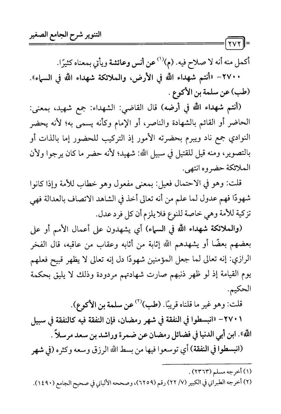 2700 - "أنتم شهداء الله في الأرض، والملائكة شهداء الله في السماء". (طب) عن سلمة بن الأكوع.