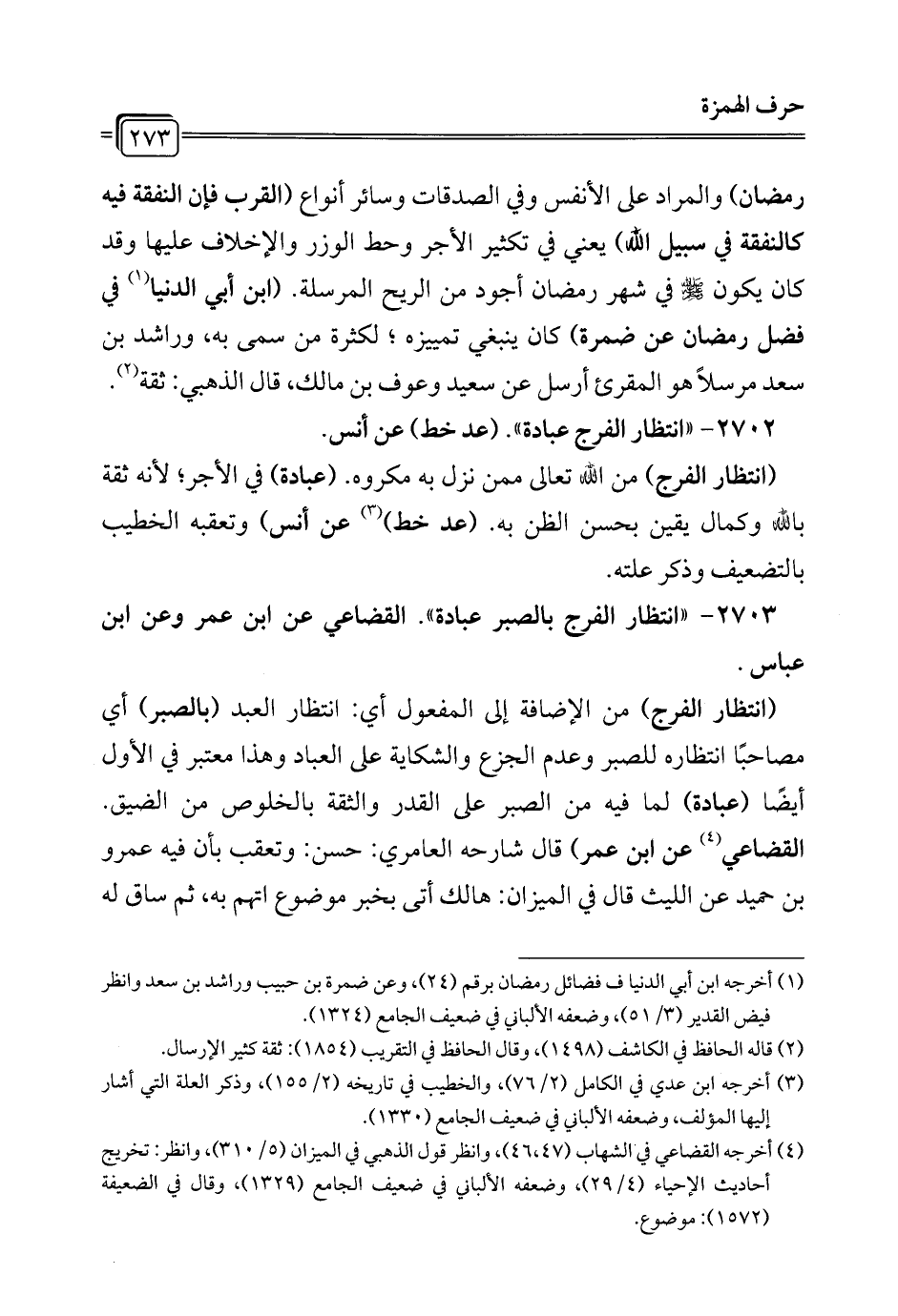 2703 - "انتظار الفرج بالصبر عبادة". القضاعي عن ابن عمر وعن ابن عباس.