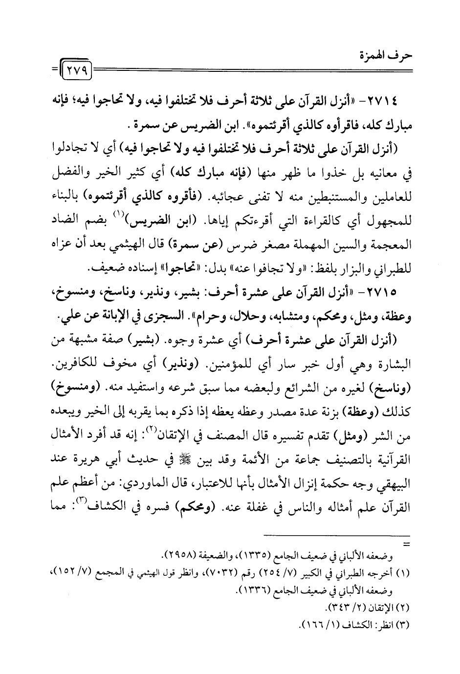2715 - "أنزل القرآن على عشرة أحرف: بشير، ونذير، وناسخ، ومنسوخ، وعظة، ومثل، ومحكم، ومتشابه، وحلال، وحرام". السجزى في الإبانة عن علي.