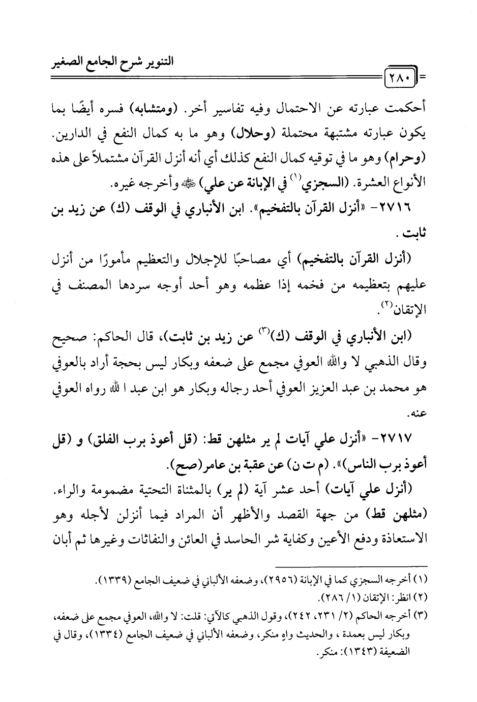 2716 - "أنزل القرآن بالتفخيم". ابن الأنباري في الوقف (ك) عن زيد بن ثابت.