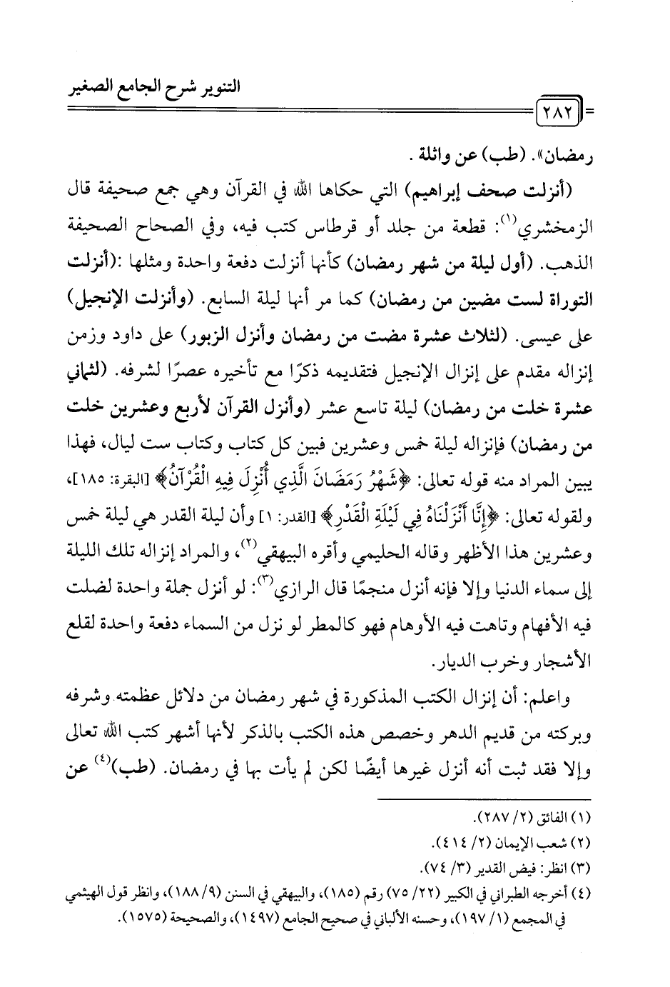 واعلم: أن إنزال الكتب المذكورة في شهر رمضان من دلائل عظمته وشرفه وبركته من قديم الدهر وخصص هذه الكتب بالذكر لأنها أشهر كتب الله تعالى وإلا فقد ثبت أنه أنزل غيرها أيضًا لكن لم يأت بها في رمضان. (طب) (¬4) عن