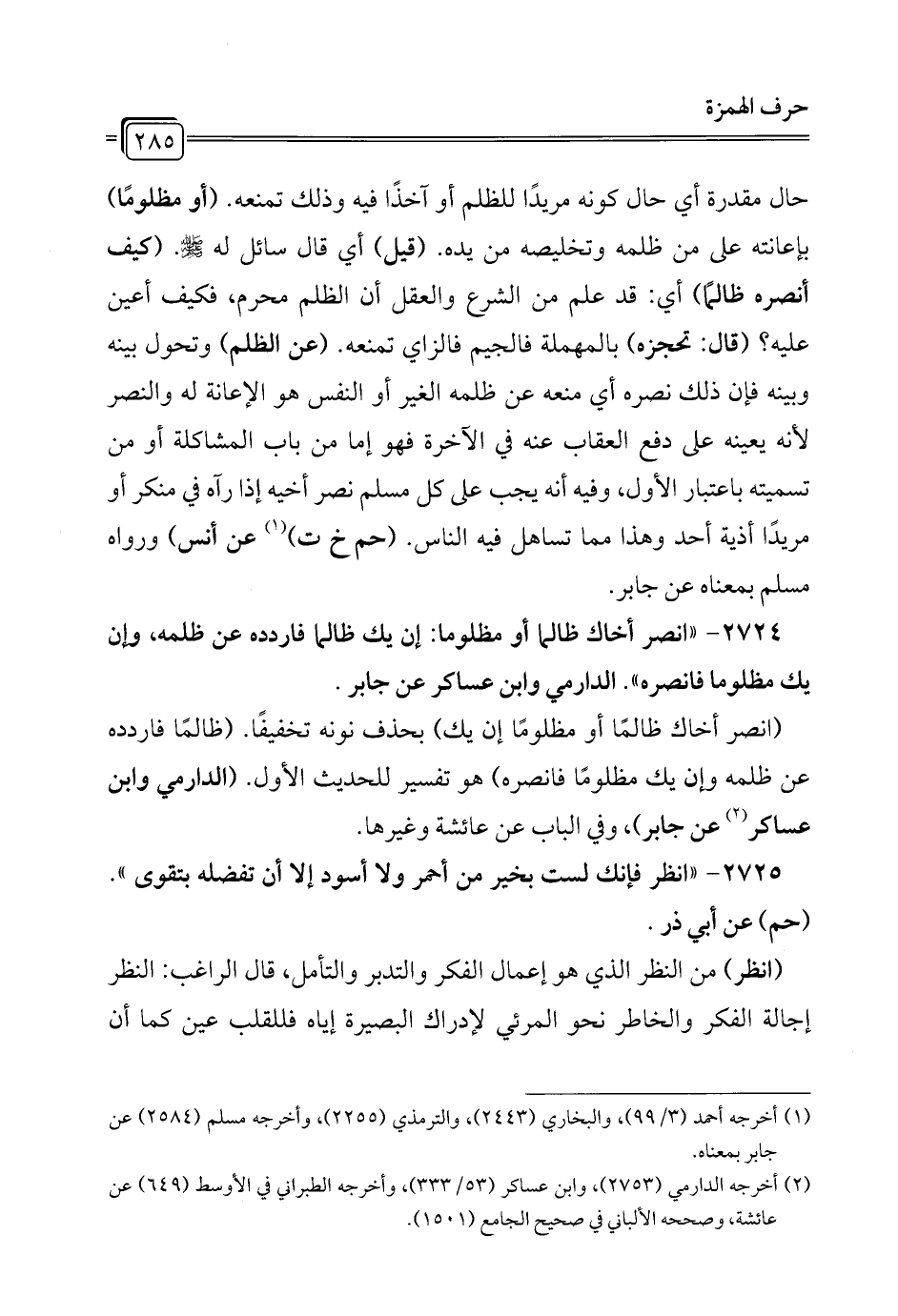 2724 - "انصر أخاك ظالما أو مظلوما: إن يك ظالما فاردده عن ظلمه، وإن يك مظلوما فانصره". الدارمي وابن عساكر عن جابر.