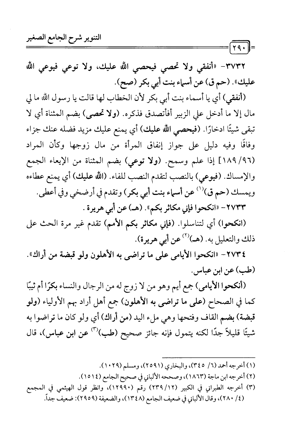 3732 - "أنفقي ولا تحصي فيحصي الله عليك، ولا توعي فيوعي الله عليك". (حم ق) عن أسماء بنت أبي بكر (صح).