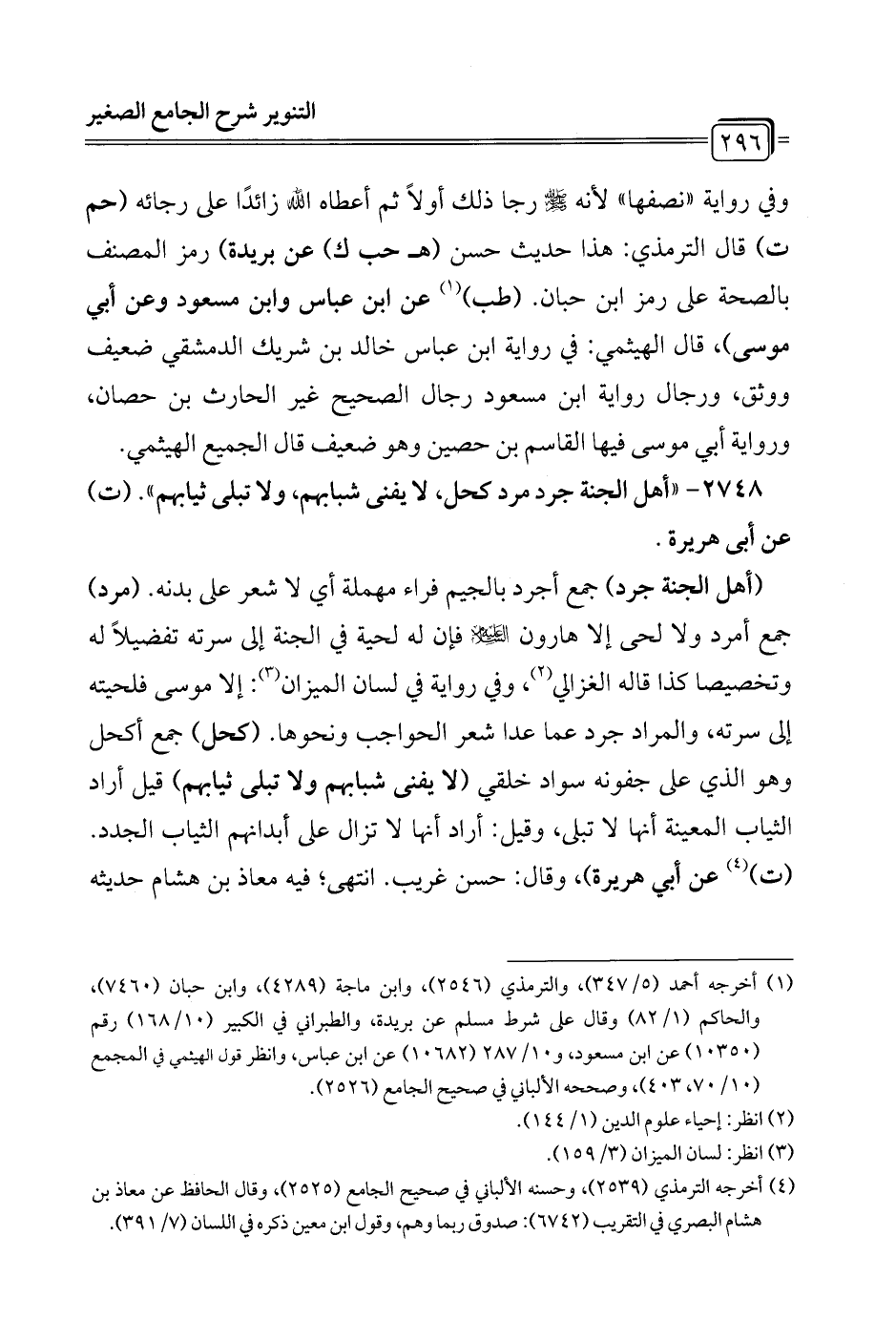 (أهل الجنة جرد) جمع أجرد بالجيم فراء مهملة أي لا شعر على بدنه. (مرد) جمع أمرد ولا لحى إلا هارون - عليه السلام - فإن له لحية في الجنة إلى سرته تفضيلاً له وتخصيصا كذا قاله الغزالي (¬2)، وفي رواية في لسان الميزان (¬3): إلا موسى فلحيته إلى سرته، والمراد جرد عما عدا شعر الحواجب ونحوها. (كحل) جمع أكحل وهو الذي على جفونه سواد خلقي (لا يفنى شبابهم ولا تبلى ثيابهم) قيل أراد الثياب المعينة أنها لا تبلى، وقيل: أراد أنها لا تزال على أبدانهم الثياب الجدد. (ت) (¬4) عن أبي هريرة)، وقال: حسن غريب. انتهى؛ فيه معاذ بن هشام حديثه