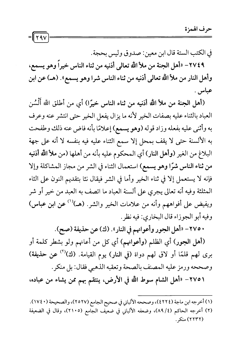 2749 - "أهل الجنة من ملأ الله تعالى أذنيه من ثناء الناس خيراً وهو يسمع، وأهل النار من ملأ الله تعالى أذنيه من ثناء الناس شرا وهو يسمع". (هـ) عن ابن عباس.