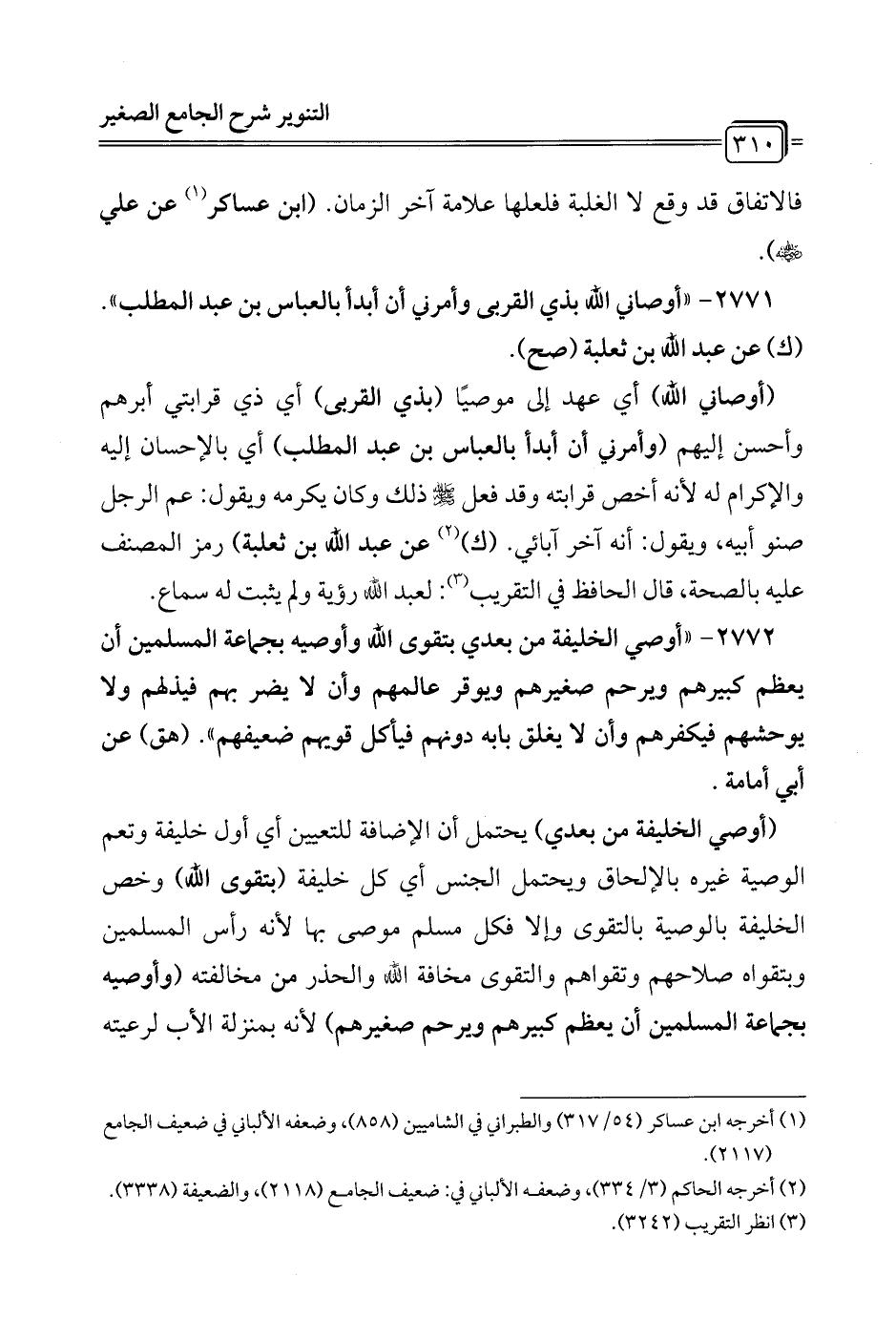2772 - "أوصي الخليفة من بعدي بتقوى الله وأوصيه بجماعة المسلمين أن يعظم كبيرهم ويرحم صغيرهم ويوقر عالمهم وأن لا يضر بهم فيذلهم ولا يوحشهم فيكفرهم وأن لا يغلق بابه دونهم فيأكل قويهم ضعيفهم". (هق) عن أبي أمامة.